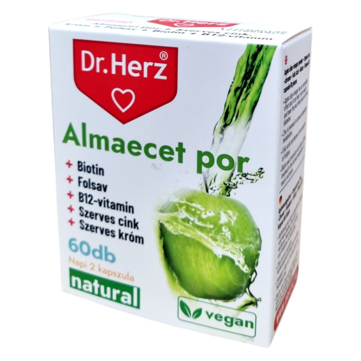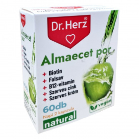 A Dr. Herz Almaecet por kapszula egy komplex étrend-kiegészítő, amely almaecet port, biotint, folsavat, B12-vitamint, szerves cinket és krómot tartalmaz. Az almaecet antioxidáns hatású lehet, és hozzájárulhat a testsúlycsökkentéshez, valamint a vércukorszint szabályozásához. A cink és a króm részt vehet a normál szénhidrát-anyagcserében, míg a folsav segíthet a fáradtság csökkentésében. A biotin és a B12-vitamin támogathatja a makro tápanyagok normál anyagcseréjét és az idegrendszer normál működését. A termék bio és vegán étrendi irányzatoknak is megfelel.