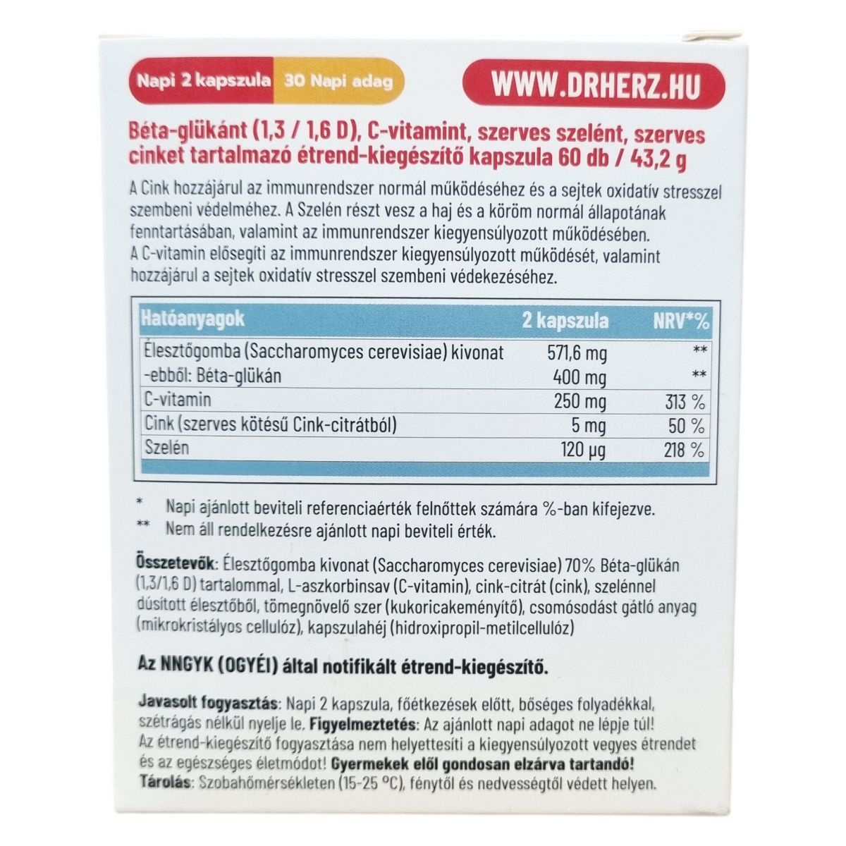 A Dr.Herz® Béta-Glükán + C-vitamin + Szerves cink + Szerves szelén kapszula egy olyan étrend-kiegészítő, amely 2 kapszula napi adagban béta-glükánt (1,3/1,6 D), C-vitamint, szerves szelént és szerves cinket tartalmaz. Ezek a hatóanyagok együttesen támogathatják az immunrendszer normál működését, hozzájárulhatnak a sejtek oxidatív stresszel szembeni védelméhez, valamint segíthetik a haj és köröm egészséges állapotának fenntartását. A béta-glükán támogatja a szervezet védekezőképességét és az anti-gyulladásos mechanizmusokat, a szelén és a cink a normál immunrendszeri funkciókat, míg a C-vitamin az antioxidáns védekezést erősítheti. A kapszula összetevői között szerepelnek természetes eredetű anyagok, mint az élesztőgomba kivonat és a szerves formában jelenlévő nyomelemek, valamint a kapszulahéj is növényi alapú, így a termék vegán életmódot követők számára is alkalmas lehet.