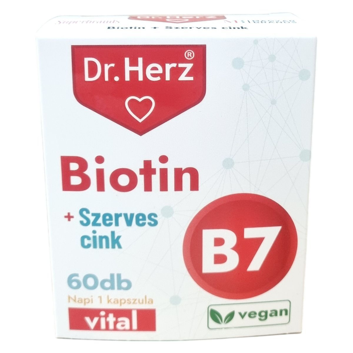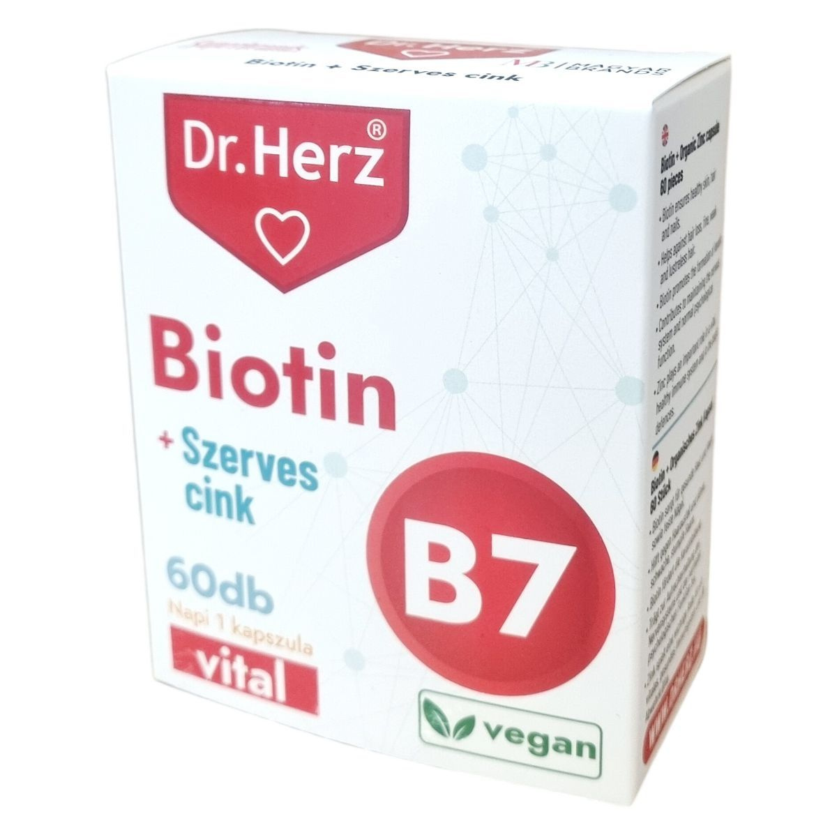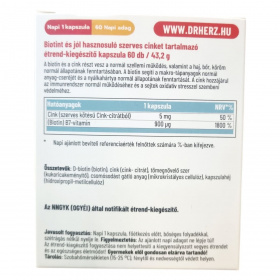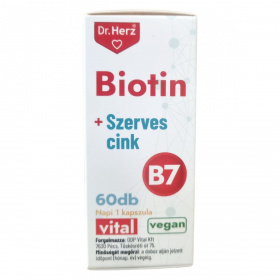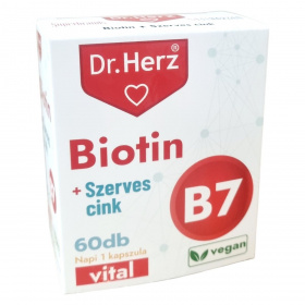 A Dr.Herz® Biotin + Szerves cink B7 kapszula biotint és jól hasznosuló szerves cinket tartalmaz. A biotin segítheti a makrotápanyagok normál anyagcseréjét, támogatja a haj, bőr és köröm egészségének fenntartását, valamint hozzájárulhat a nyálkahártya normál állapotához. A cink fontos szerepet játszhat az immunrendszer normál működésében és a sejtek oxidatív stressz elleni védelmében. A termék különösen ajánlott azoknak, akik a hajhullás, gyenge vagy fénytelen haj ellen szeretnének lépéseket tenni, illetve támogatnák idegrendszerük és pszichológiai funkcióik egészségét. A kapszulák napi egyszeri adagolása mellett a biotin elősegítheti a keratin képződését, míg a cink részt vehet a vitalitás és a testi ellenálló képesség javításában.