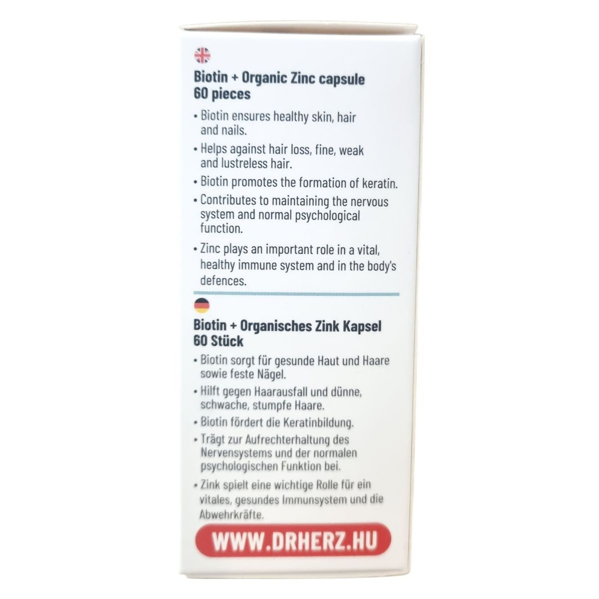 Biotin és szerves cink kombinációja, amely támogatja a bőr, haj, köröm és az idegrendszer normál működését, továbbá hozzájárulhat az immunrendszer megfelelő működéséhez.