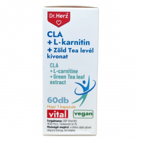 A Dr.Herz® CLA + L-karnitin + Zöld Tea levél kivonat kapszula egy 60 darabos kiszerelésű étrend-kiegészítő, mely konjugált linolsavat (CLA), L-karnitint és zöld tea levél kivonatot tartalmaz. A CLA linolsav, amely támogathatja az anyagcserét és hozzájárulhat a megfelelő koleszterinszint fenntartásához. Az L-karnitin szerepet játszik a zsírsavak sejtek mitokondriumaiba történő szállításában, ezáltal elősegítheti az energiatermelést. A zöld tea levél kivonat hozzájárulhat az alvás közbeni anyagcsere és energiapazarlás támogatásához, valamint a zsírok oxidációjához, ami segítheti a testsúly kontrollját. A készítmény kapszulahéja növényi eredetű, így vegán étrendbe is beilleszthető. A termék szedése javasolt főétkezés előtt, egy kapszulával, bőséges folyadékkal. Fontos betartani a javasolt napi adagot, továbbá gyermekek, várandós és szoptatós nők számára nem ajánlott. Az étrend-kiegészítő alkalmazása nem helyettesíti a kiegyensúlyozott és vegyes étrendet, valamint az egészséges életmódot.