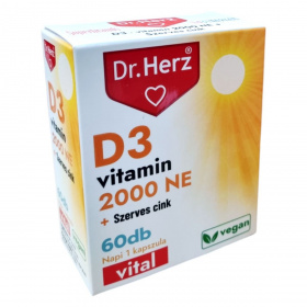 A Dr. Herz D3 vitamin 2000 NE + Szerves cink kapszula egy étrend-kiegészítő, amely D3-vitamint és jól hasznosuló szerves cinket tartalmaz. A D-vitamin hozzájárulhat az egészséges csontozat, izomfunkció és az immunrendszer normál működéséhez, valamint szerepet játszhat a sejtosztódásban és a kalcium, foszfor normál felszívódásában. A cink hozzájárulhat az immunrendszer normál működéséhez, a sejtek védelméhez, a normál szellemi működéshez, valamint a bőr, köröm és haj normál állapotának fenntartásához. A termék napi ajánlott mennyisége 1 kapszula, amelyet főétkezés előtt, bőséges folyadékkal, szétrágás nélkül kell bevenni. A termék bio és vegán étrendi irányzatoknak is megfelelhet.