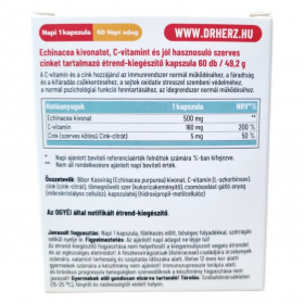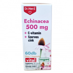 A Dr. Herz Echinacea 500 mg + C-vitamin + Szerves cink kapszula egy étrend-kiegészítő, amely Echinacea kivonatot, C-vitamint és jól hasznosuló szerves cinket tartalmaz. Az összetevők hozzájárulhatnak az immunrendszer normál működéséhez, a fáradtság és a kifáradás csökkentéséhez, valamint a sejtek oxidatív stresszel szembeni védelméhez. A termék bio és vegán étrendi irányzatoknak is megfelel. Az OGYÉI által notifikált étrend-kiegészítő, melynek fogyasztása nem ajánlott terheseknek, szoptató anyáknak, 12 év alatti gyermekeknek és immunszupresszív terápiát alkalmazóknak.