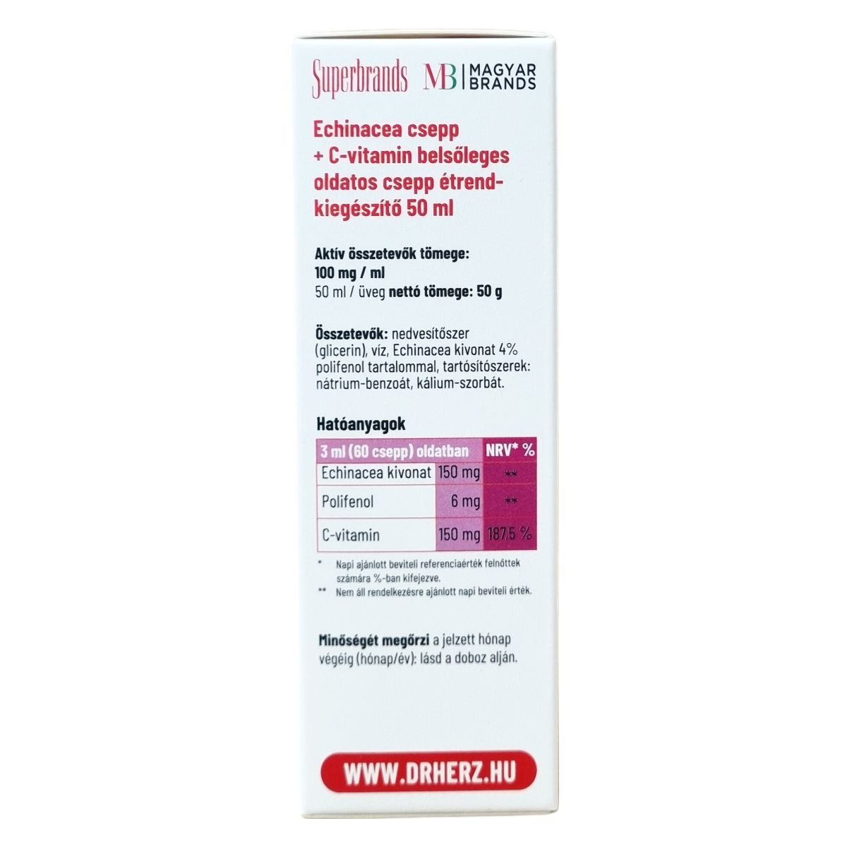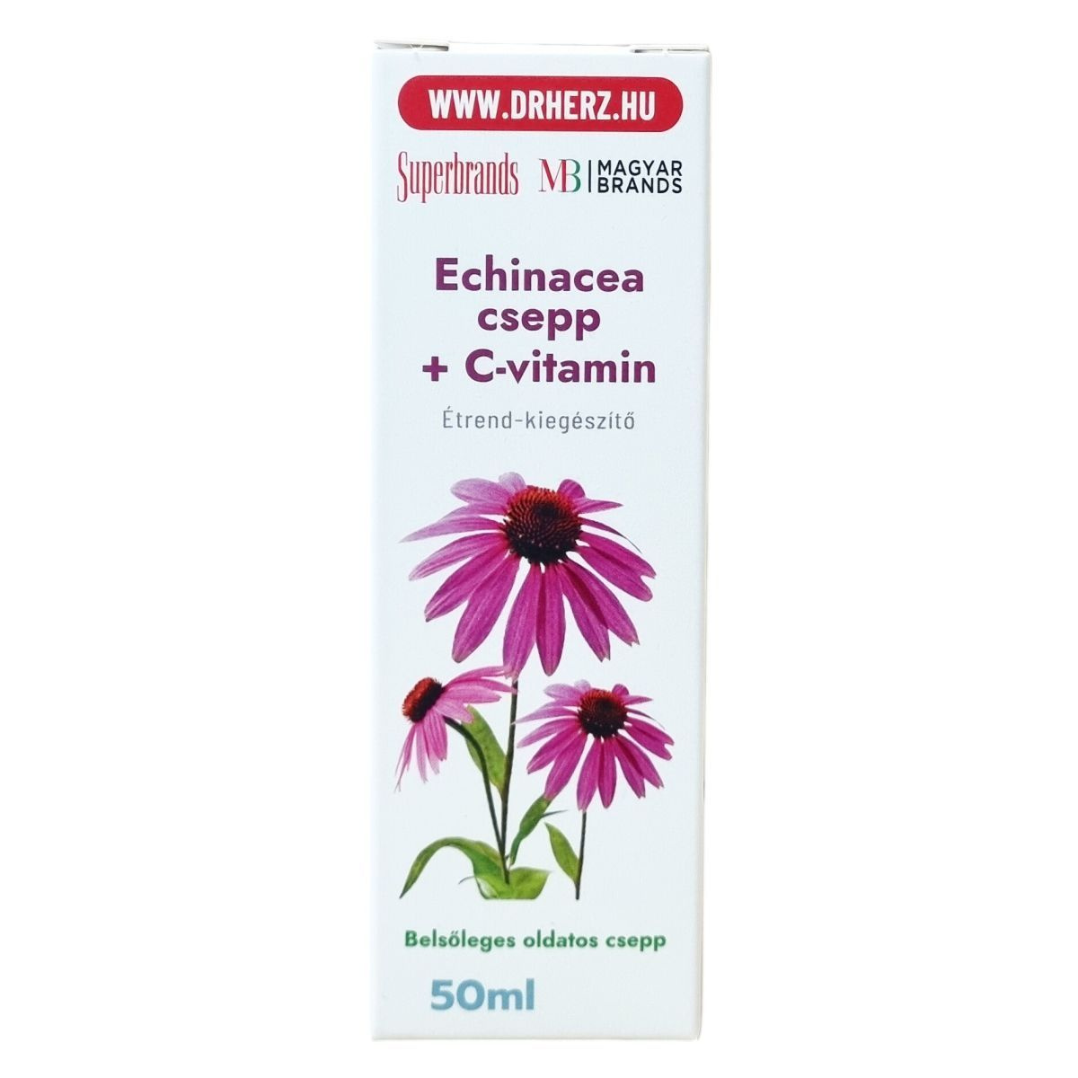 Echinacea purpurea kivonatot és C-vitamint tartalmazó étrend-kiegészítő csepp.
