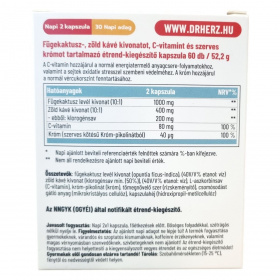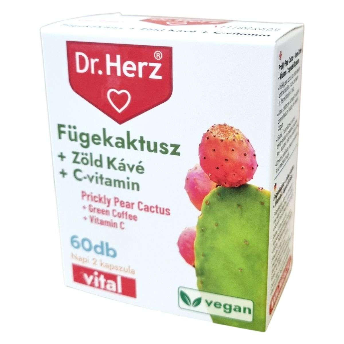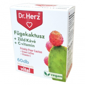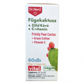 A Dr.Herz Fügekaktusz + Zöld Kávé + C-vitamin egy komplex étrend-kiegészítő, mely fügekaktuszlevél kivonatot, zöld kávé kivonatot, C-vitamint és szerves krómot tartalmaz. A fügekaktusz hozzájárulhat a emésztés és az anyagcsere támogatásához, valamint a zsírok anyagcseréjéhez. A zöld kávé elősegítheti a koncentráció képességét és csökkentheti a fáradtságérzetet. A C-vitamin hozzájárulhat a normál energiatermelő anyagcsere-folyamatokhoz és a sejtek oxidatív stresszel szembeni védelméhez. A króm segíthet a normál vércukorszint fenntartásában. A termék napi két kapszula adagban, főétkezések előtt ajánlott fogyasztásra, és a vegán étrendet követők számára is alkalmas. Fontos megjegyezni, hogy a termék koffeint is tartalmaz, ezért koffeinre érzékenyeknek nem ajánlott. Az ajánlott napi adagot nem szabad túllépni, és a termék nem helyettesíti a változatos étrendet és az egészséges életmódot.