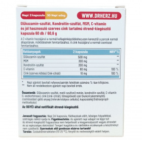 A készítmény glükozamin-szulfátot tartalmaz, amely hozzájárulhat a porcok egészségének fenntartásához. A kondroitin-szulfát segítheti az ízületek számára szükséges kenőfolyadék mennyiségét, míg az MSM támogatja az ízületi szövet rugalmasságát és az ízületek erősségét. A C-vitamin részt vehet az egészséges vérerek, csontok, porcok, bőr és fogak normál működésében, valamint a kollagénképződésben. A szerves kötésű cink fontos szerepet játszhat az immunrendszer működésében és a szervezet védekezőképességében. A tájékoztató felhívja a figyelmet arra, hogy a termék fogyasztása nem helyettesíti a kiegyensúlyozott étrendet és az egészséges életmódot, valamint hogy tengeri eredetű allergiások számára nem ajánlott. A kapszulákat javasolt napi két alkalommal, főétkezések előtt bőséges folyadékkal lenyelni.