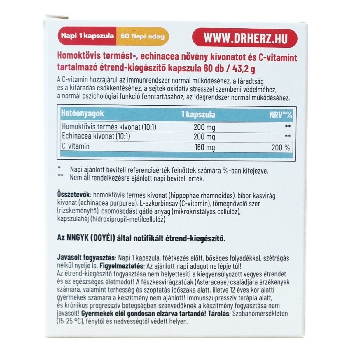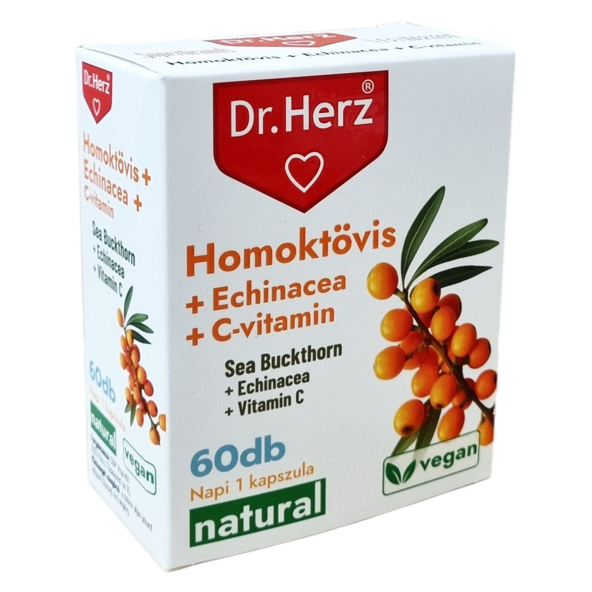 A Dr.Herz Homoktövis + Echinacea + C-vitamin kapszula 60 darabos kiszerelésben készül. A homoktövis termése összetett vitaminokat, tápanyagokat és esszenciális zsírsavakat tartalmaz, amelyek hozzájárulhatnak az immunrendszer erősítéséhez. Az echinacea növényi kivonat támogatja az immunrendszer működését, különösen ajánlott kiegészítő és megelőző kezelésként légúti és húgyúti fertőzések esetén. A C-vitamin szintén hozzájárul az immunrendszer egészségéhez, csökkentheti a fáradtságot és a kifáradást, segítheti a sejtek oxidatív stresszel szembeni védelmét, valamint támogathatja a pszichológiai és idegrendszer normál funkcióit. A kapszula vegán összetevőkből áll, szétrágás nélkül, bőséges folyadékkal ajánlott fogyasztani. A termék nem helyettesíti a változatos, kiegyensúlyozott étrendet és az egészséges életmódot.