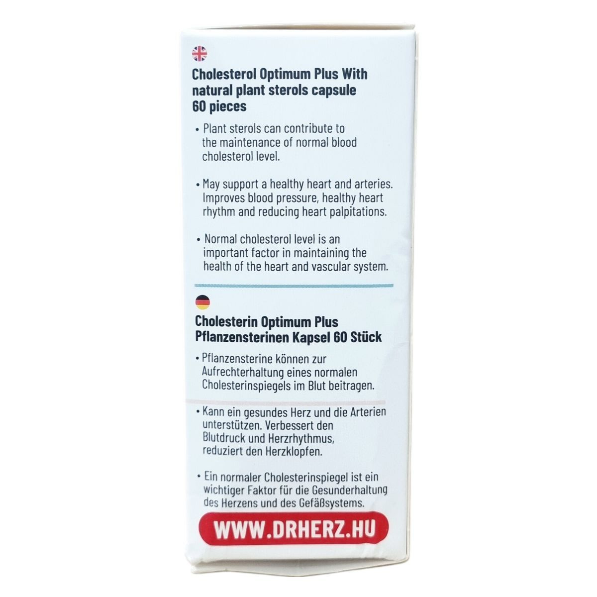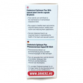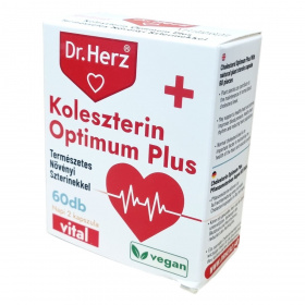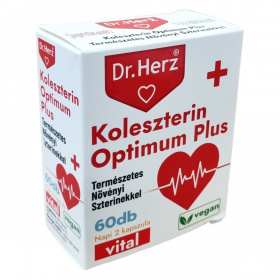 A Dr.Herz Koleszterin Optimum Plus természetes növényi szterinekkel tartalmazó kapszula 60 darabos kiszerelésben készül. A természetes növényi szterinek hozzájárulhatnak a vér normál koleszterinszintjének fenntartásához, amely fontos a szív és az érrendszer egészségének megőrzésében. A termék napi 2 kapszula fogyasztásával ajánlott, a kedvező hatás napi 800 mg növényi szterin bevitelével érhető el. A természetes összetevők között szerepelnek növényi szterinek, kukoricakeményítő mint tömegnövelő szer, mikrokristályos cellulóz csomósodást gátló anyagként, valamint vegán kapszulahéj, mely hidroxipropil-metilcellulózból áll. A készítmény nem tartalmaz állati eredetű összetevőket, ezért vegán étrendbe is beilleszthető. Fontos betartani az ajánlott adagolást, és a termék fogyasztása nem helyettesíti a kiegyensúlyozott étrendet és egészséges életmódot. Terhesség és szoptatás ideje alatt a használata nem javasolt, valamint 3 gramm feletti napi növényi szterinbevitel kerülendő. A koleszterinszint-csökkentő gyógyszeres kezelés alatt álló személyek csak orvosi felügyelettel használhatják a terméket. A készítményt gyermekektől elzárva kell tartani, és tárolása szobahőmérsékleten, fénytől és nedvességtől védett helyen ajánlott.