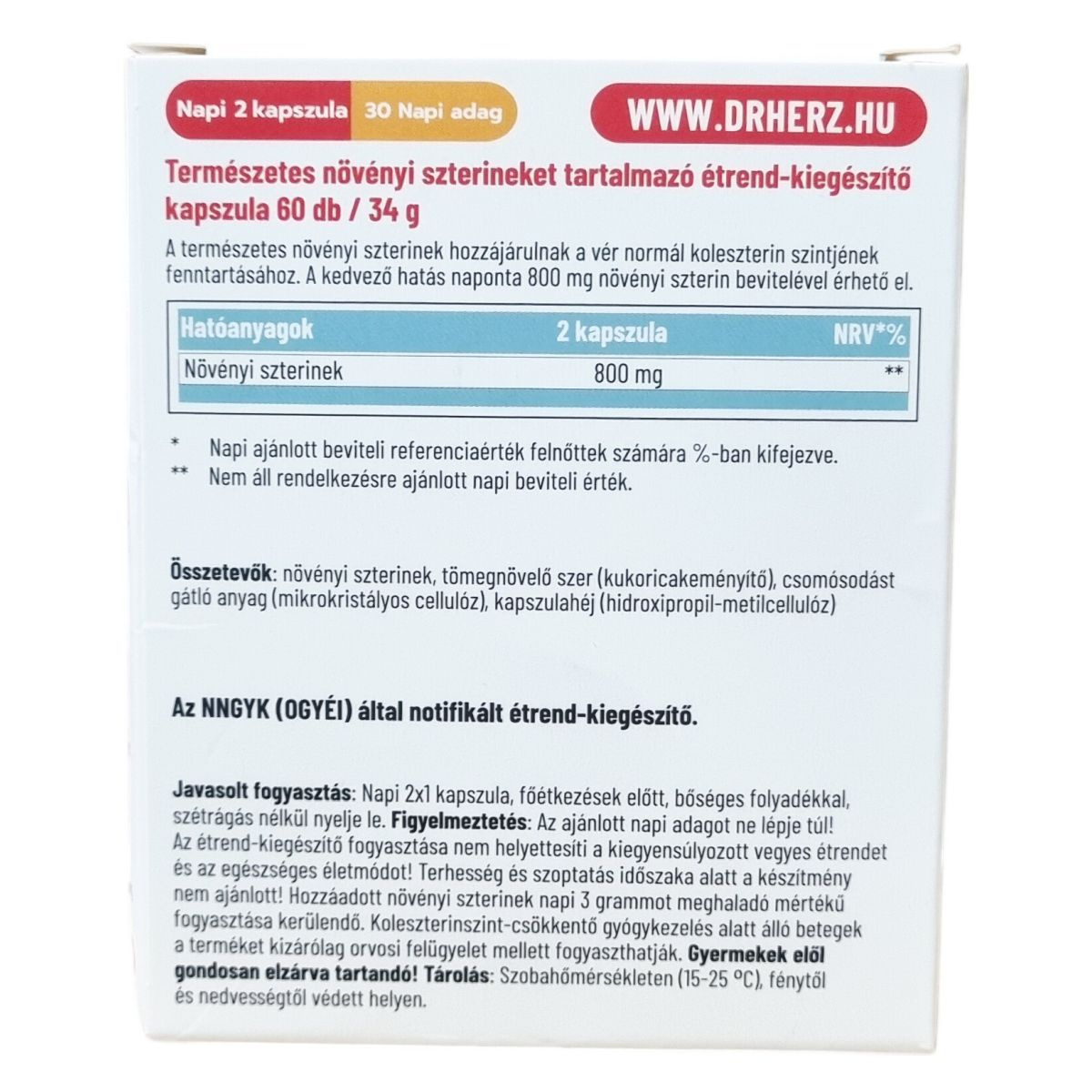 Az ajánlott napi adagot ne lépje túl! Az étrend-kiegészítő fogyasztása nem helyettesíti a kiegyensúlyozott vegyes étrendet és az egészséges életmódot! Terhesség és szoptatás időszaka alatt a készítmény nem ajánlott! Hozzáadott növényi szterinek napi 3 grammot meghaladó mértékű fogyasztása kerülendő. Koleszterinszint-csökkentő gyógyszeres kezelés alatt álló betegek a terméket kizárólag orvosi felügyelet mellett fogyaszthatják. Gyermekek elől gondosan elzárva tartandó!