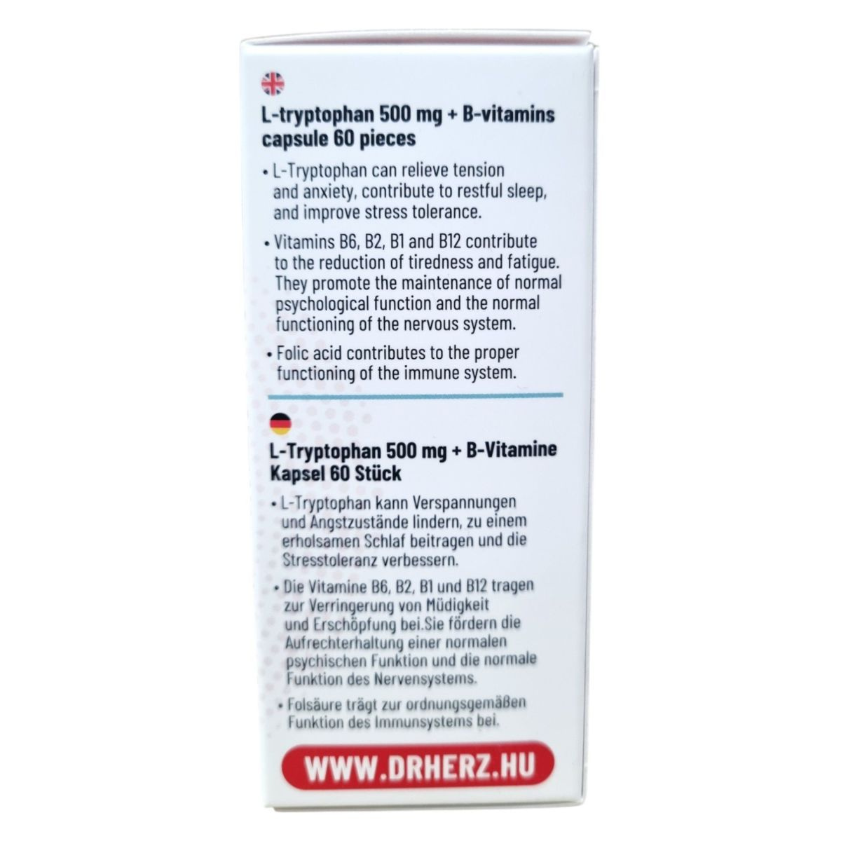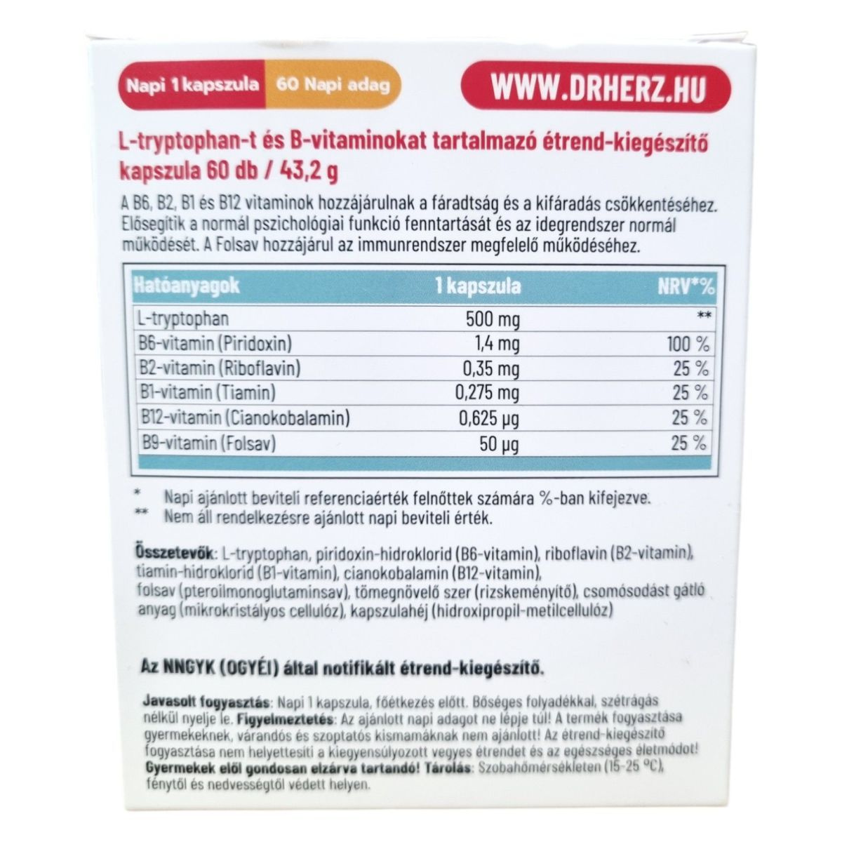 A Dr. Herz L-tryptophan 500 mg + B-vitaminok étrend-kiegészítő kapszula 60 db-os kiszerelésben kapható. Az L-tryptophan hozzájárulhat a feszültség és szorongás enyhítéséhez, valamint a pihentető alvás elősegítéséhez. A B6, B2, B1 és B12 vitaminok csökkenthetik a fáradtságot és a kifáradást, elősegíthetik a normál pszichológiai funkció fenntartását és az idegrendszer normál működését. A folsav támogathatja az immunrendszer megfelelő működését. A termék vegán étrendbe illeszthető.