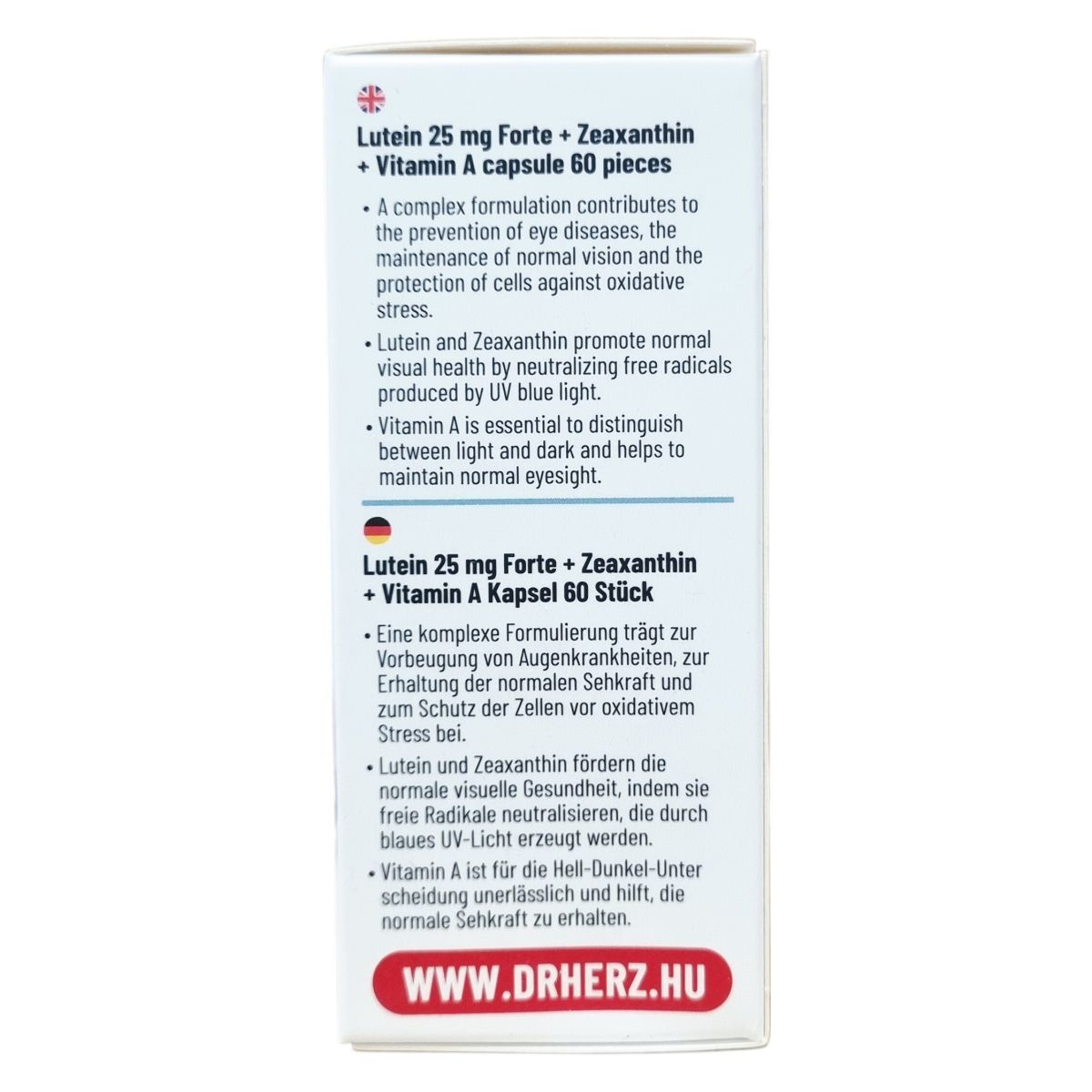 A Dr.Herz Lutein 25 mg Forte + Zeaxantin + Vitamin A kapszula komplex formulája hozzájárulhat a szem egészségének megőrzéséhez, a normál látás fenntartásához és a sejtek oxidatív stresszel szembeni védelméhez. A lutein és a zeaxantin elősegítheti a normál vizuális egészséget azáltal, hogy semlegesítheti az UV-kék fény által előállított szabad gyököket. A-vitamin szerepet játszhat a fény és sötétség közötti különbség felismerésében és hozzájárulhat az egészséges látás fenntartásához. Az ajánlott napi adag egy kapszula, melyet főétkezések előtt kell bevenni bőséges folyadékkal, szétrágás nélkül. A termék összetevői között megtalálhatóak a természetes növényi eredetű anyagok, mikrokristályos cellulóz, kukoricakeményítő és egy növényi eredetű kapszulahéj is. A termék vegán étrendbe illeszthető, és megfelel az OGYÉI előírásainak.