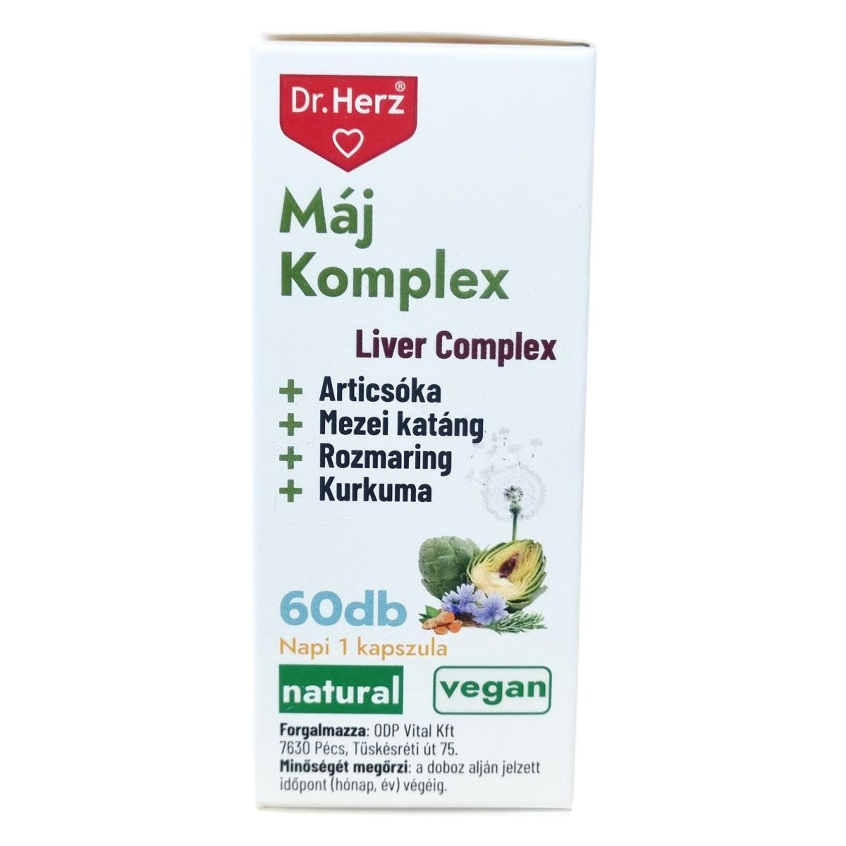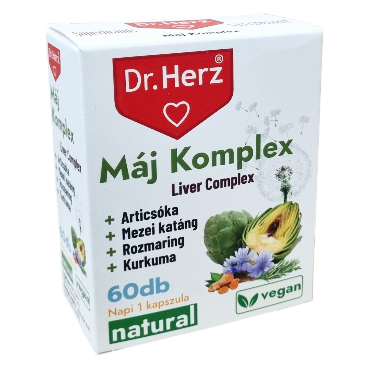 A Dr.Herz® Máj Komplex egy természetes összetevőkből álló étrend-kiegészítő kapszula, amely 60 darabos kiszerelésben kerül forgalomba. Hatóanyagai között szerepel az articsóka, amely támogatja a máj és epe működését, valamint serkenti az epe termelését. A mezei katáng, rozmaring, kurkuma és pitypang gyökér hozzájárulhat az anyagcsere folyamatokhoz. A máriatövis antioxidáns hatása révén segítheti a máj regenerációját, míg a B6-vitamin részt vesz a normál fehérje- és glikogén-anyagcserében, a vörösvérsejt-képződésben és az immunrendszer támogatásában. A termék vegán összetételű, napi egy kapszula fogyasztása javasolt főétkezések előtt. A kapszula növényi eredetű héjjal készül, és mentes minden állati eredetű összetevőtől.