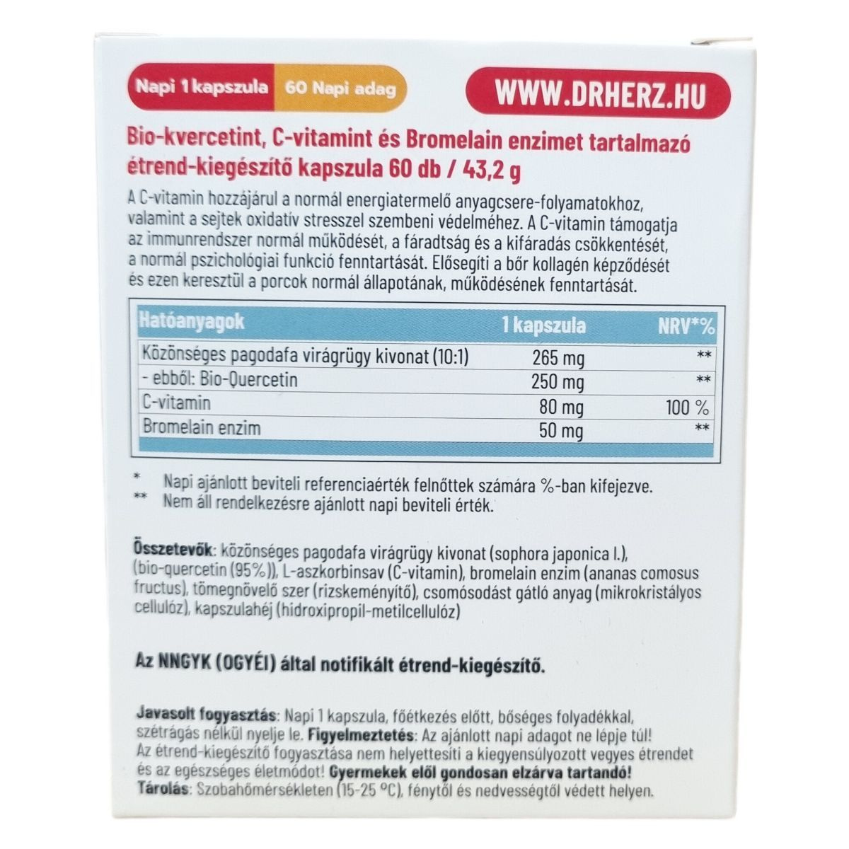 A Dr.Herz® Quercetin 250 mg + C-vitamin + Bromelain enzim kapszula egy olyan étrend-kiegészítő, amely egyenletesen biztosítja a hatóanyagokat naponta. A quercetin hozzájárulhat a szív- és érrendszer működéséhez, támogathatja az immunrendszer egészségét és antimikrobiális hatással bírhat. A C-vitamin szerepet játszik a normál energiatermelő anyagcsere-folyamatokban és a sejtek oxidatív stresszel szembeni védelmében, továbbá csökkentheti a fáradtság érzetét és támogathatja a bőr kollagén képződését, amely fontos a porcok egészségéhez. A bromelain enzim gyulladáscsökkentő és zsírégető hatású lehet, továbbá segítheti az immunrendszer szabályozását és az ízületi fájdalom enyhítését. A termék vegán és bio minősítésű, kapszulahéja növényi eredetű, így különböző étrendekbe is jól illeszthető.