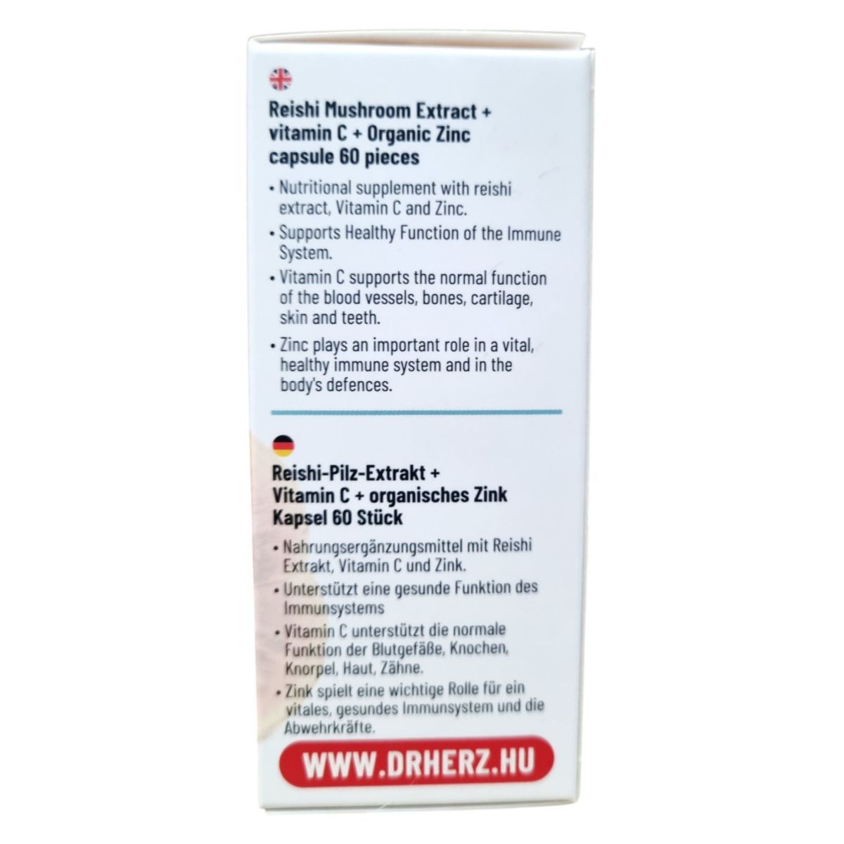 A Dr. Herz Reishi Pecsétviaszgomba kapszula egy természetes alapanyagokból készült étrend-kiegészítő, amely pecsétviaszgomba kivonatot, C-vitamint és szerves cinket tartalmaz. A termék napi egy kapszula fogyasztását javasolja, amely hozzájárulhat az immunrendszer normál működéséhez, a csontozat fenntartásához, valamint a bőr, a köröm és a haj normál állapotának megőrzéséhez. A termék bio és vegán étrendi irányzatoknak is megfelel, és szobahőmérsékleten tárolandó. Forgalmazója az ODP Vital Kft, és az OGYÉI által notifikált termék.