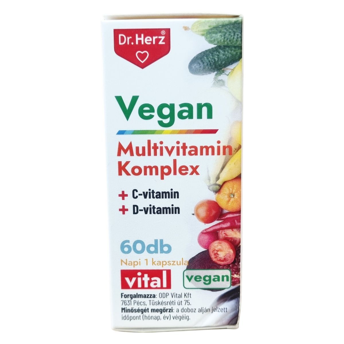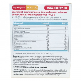 A Dr.Herz Vegan Multivitamin Komplex + C-vitamin + D-vitamin kapszula kifejezetten a vegán étrendet követők számára készült, hogy pótolja a szervezet számára fontos vitaminokat és ásványi anyagokat. Hozzájárulhat az immunrendszer normál működéséhez, a szellemi működés fenntartásához és az idegrendszer megfelelő működéséhez. A termék segítheti a fáradtság leküzdését, támogathatja az emésztést, javíthatja a szervezet terhelhetőségét és csökkentheti a stresszt. Napi egy kapszula fogyasztása ajánlott, főétkezés előtt, bőséges folyadékkal. A készítmény nem helyettesíti a változatos étrendet és az egészséges életmódot.