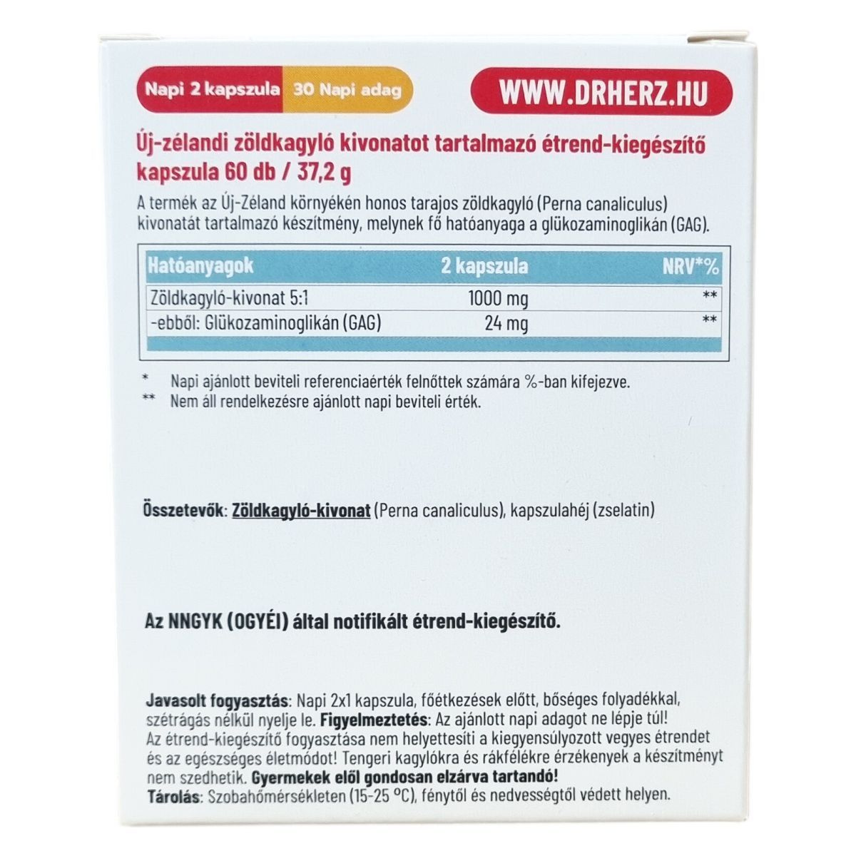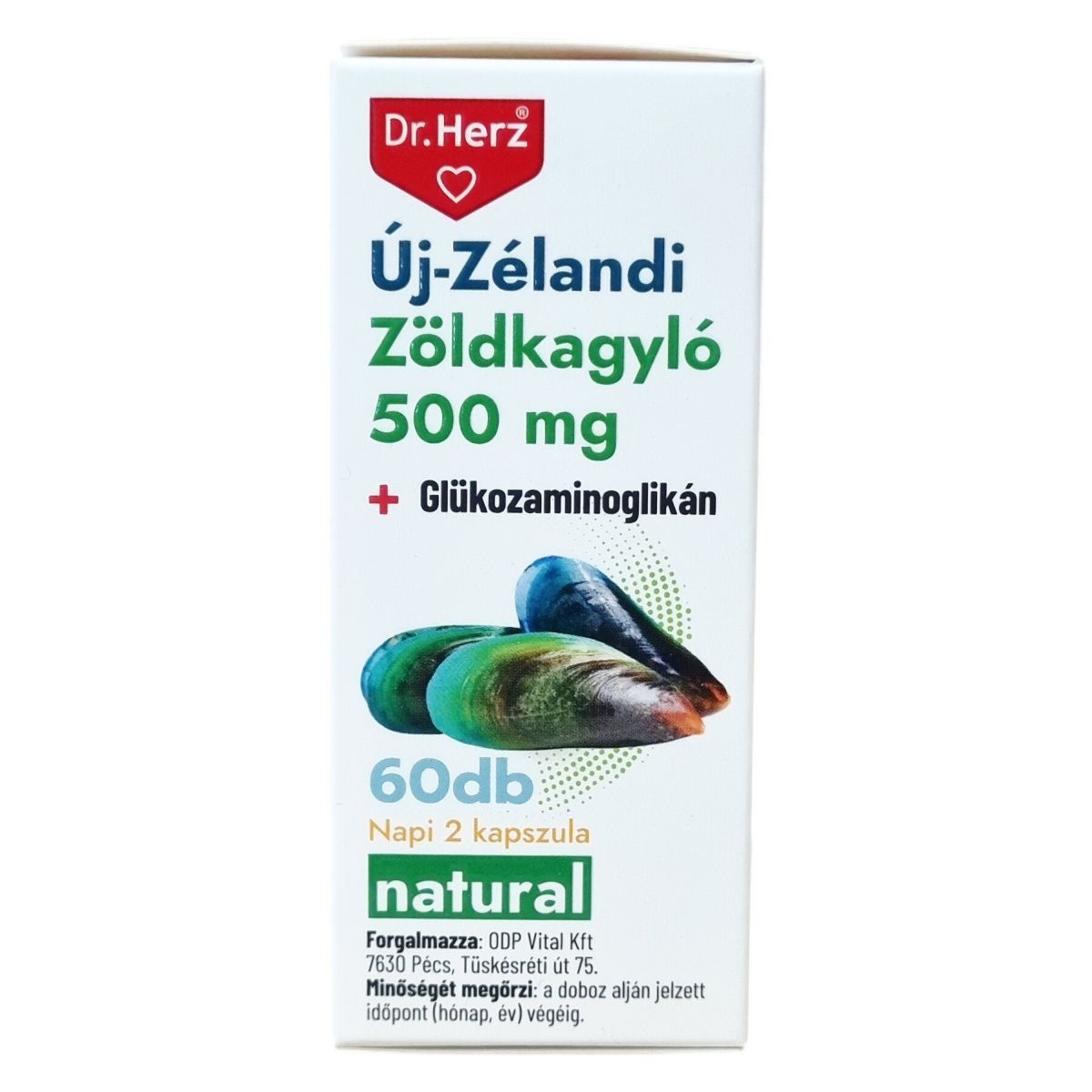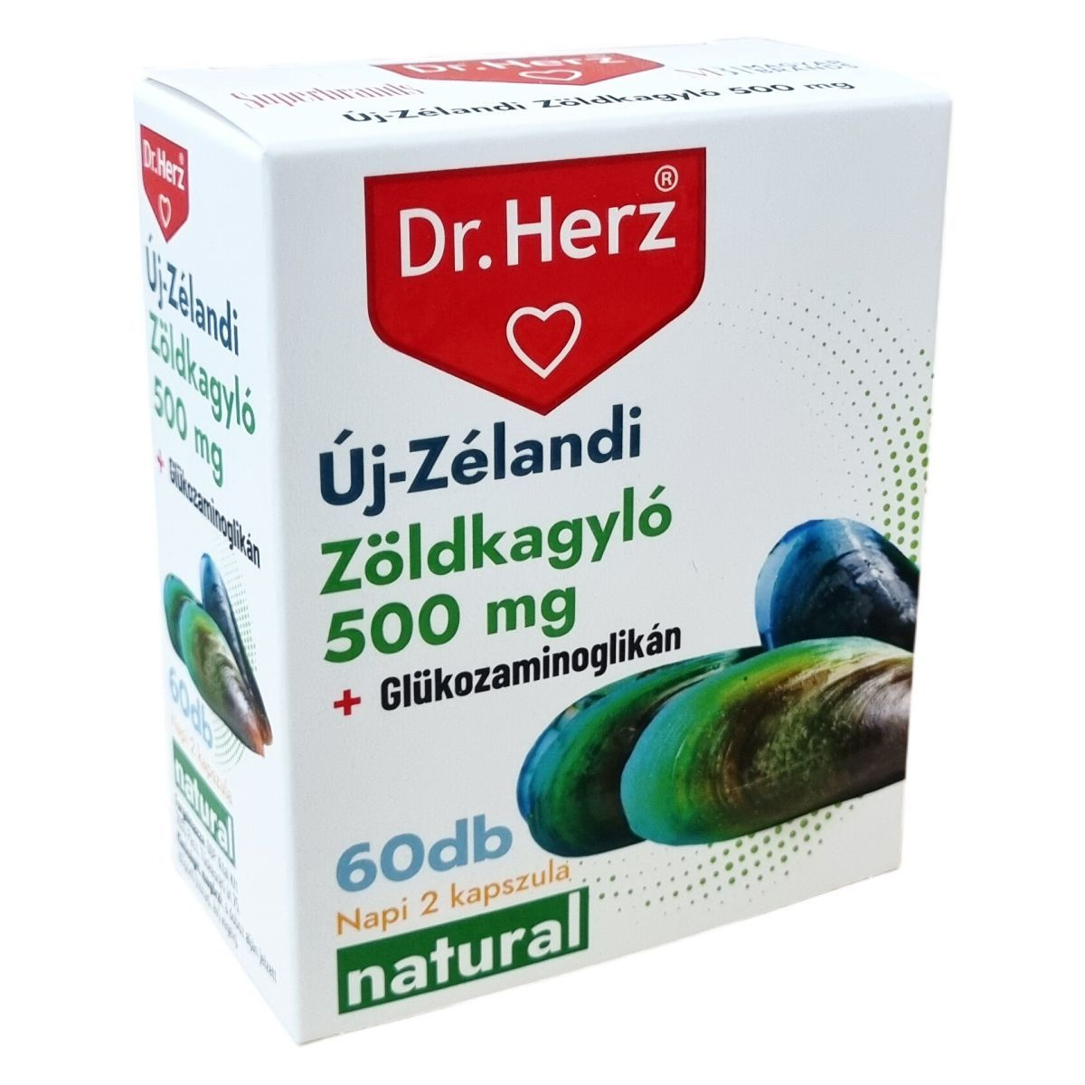A Dr.Herz Új-Zélandi Zöldkagyló készítmény az Új-Zéland környékén honos tarajos zöldkagyló (Perna canaliculus) kivonatát tartalmazza, melynek fő hatóanyaga a glükozaminoglikán (GAG). A GAG természetesen előfordul az emberi kötőszövetekben, ízületi porcszövetben és szinoviális folyadékban. Ez az összetevő segítheti a szervezet természetes folyamatát a sérült porc javításában és újjáépítésében. Minden kapszula 500 mg tiszta zöldkagyló-koncentrátumot tartalmaz. Az étrend-kiegészítő napi két kapszulás adagolása javasolt.