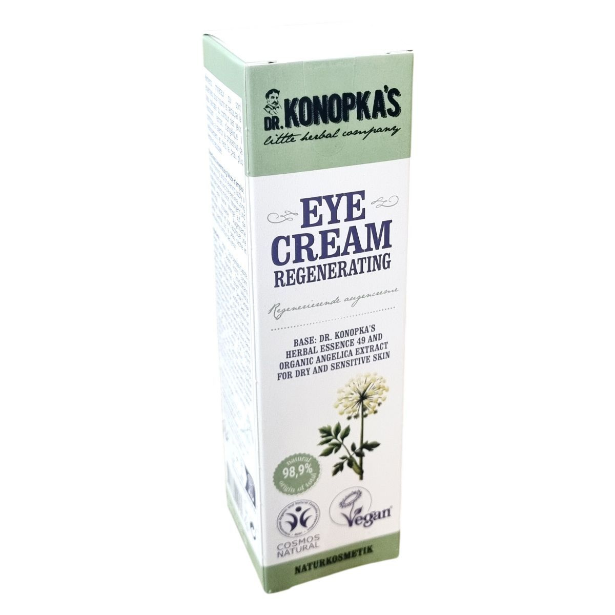 A Dr. Konopka’s regeneráló szemránckrém Dr. Konopka speciális gyógynövényes esszenciáján alapul, amely vitaminokat és ásványi anyagokat tartalmaz. Ezek elengedhetetlenek a szem körüli finom bőr táplálásához és regenerálásához. Az angyalgyökér kivonattal kombinálva segít lassítani a természetes öregedési folyamatokat, valamint feszesebb és teltebb megjelenést kölcsönöz a bőrnek. A termék 98,9%-ban természetes eredetű összetevőket tartalmaz, Európában készült.