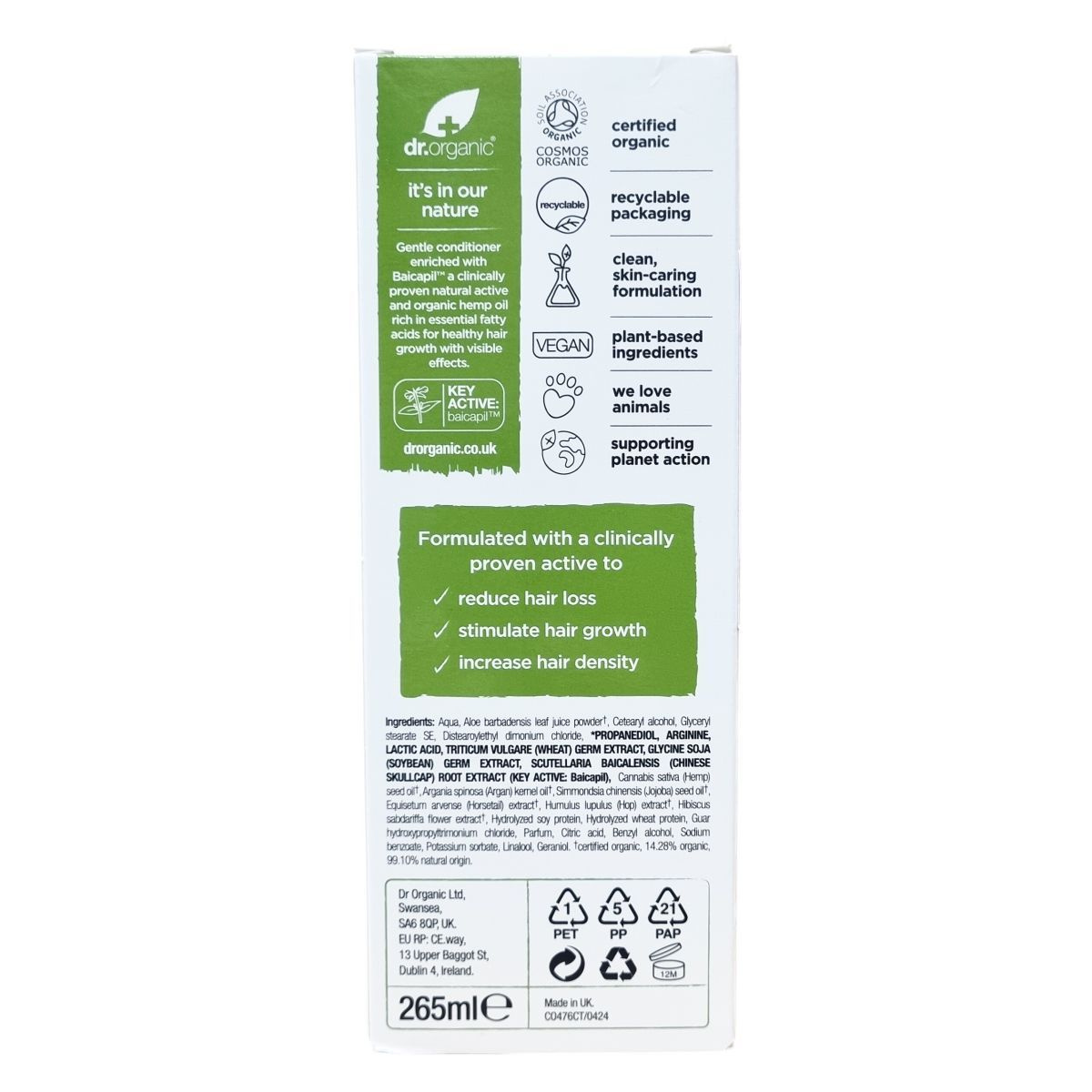 A dr.organic® Rescue & Restore Conditioner egy különleges, természetes összetevőkből, köztük a klinikailag igazolt Baicapil -ból és organikus kendermagolajból készült kondicionáló, mely támogatja a haj egészséges növekedését, csökkenti a hajhullást és növeli a haj sűrűségét. Természetes, bőrbarát formulával rendelkezik, újrahasznosítható csomagolásban érhető el, valamint vegán és állatkísérlet-mentes termék. Ajánlott a dr.organic háromlépéses programjával együtt használni, amely samponból, kondicionálóból és kezelőhabból áll, a legjobb eredmények elérése érdekében.