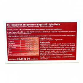 A Dr. Theiss IRON energy étrend-kiegészítő rágótabletta vasat, cinket és B-vitaminokat tartalmaz, továbbá C-vitaminnal került kiegészítésre, amely fokozhatja a vas felszívódását. A folsav, valamint a B6- és B12-vitaminok hozzájárulhatnak a normál vörösvérsejt-képződéshez, míg a vas, a folsav, a C-, a B6- és a B12-vitaminok támogatni segíthetik a fáradtság és kifáradás csökkentését, valamint az immunrendszer normál működését. A cink hozzájárulhat a sejtek oxidatív stresszel szembeni védelméhez és az immunrendszer támogatásához. A termék édesítőszereket tartalmaz, alma és szőlő aroma ízesítéssel készült, így kellemes rágótabletta formájában segítheti a napi tápanyagbevitelt.
