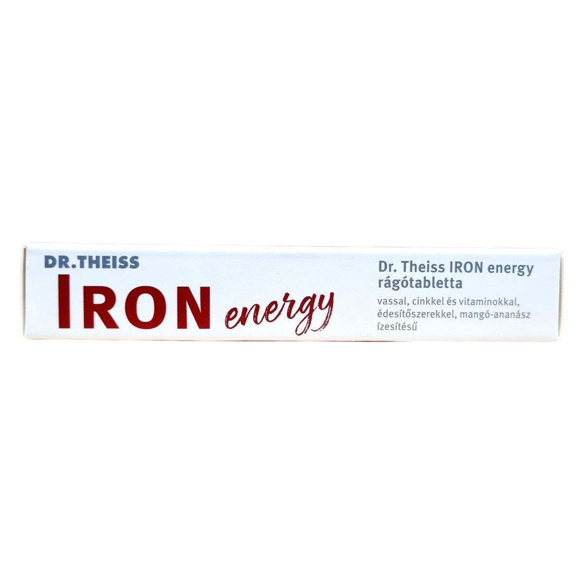 A Dr. Theiss IRON energy rágótabletta mangó-ananász ízesítésű étrend-kiegészítő, amely vasat, cinket és különböző vitaminokat tartalmaz. A termék célja, hogy támogassa a normál vörösvérsejt- és hemoglobin-képződést, az immunrendszer normál működését, valamint csökkentse a fáradtságot és a kifáradást. A C-vitamin fokozhatja a vas felszívódását, míg a cink hozzájárulhat a sejtek oxidatív stresszel szembeni védelméhez. A termék felnőttek számára készült, és napi egy rágótabletta fogyasztása javasolt.