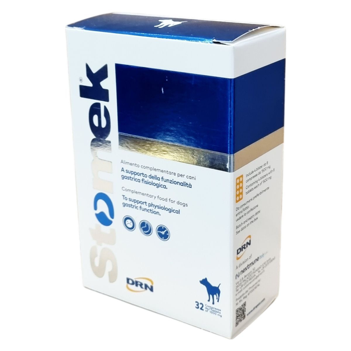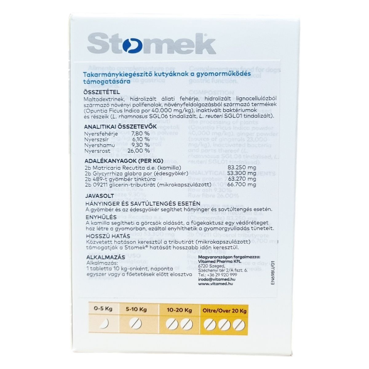 A Stomek tabletták gyomorműködés támogatására készültek kutyák számára. A gyömbér és az édesgyökér hozzájárulhat hányinger és savtúltengés csökkentéséhez. A kamilla segítheti a görcsök oldását, míg a fügekaktusz egy védőréteget hozhat létre a gyomorban, amely enyhítheti a gyomorgyulladás tüneteit. A mikrokapszulázott glicerin-tributirát hosszabb távú hatást segíthet támogatni. A termék 4 blisztert tartalmaz, mindegyik 8 tablettát 1500 mg-os kiszerelésben. Alkalmazása naponta egyszer ajánlott, testsúly szerint adagolva. A gyártó Nextmune Italy S.R.L., a forgalmazó pedig a Vitamed Pharma Kft.
