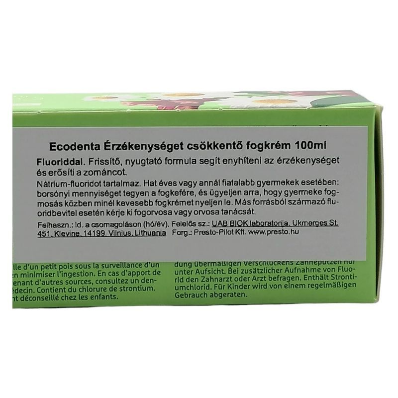 Összetevők: Glycerin*, Aqua*, Hydrated Silica*, Potassium Nitrate, Strontium Chloride*, Calcium Hydroxyapatite*, Sodium Cocoyl Glutamate*, Aroma, Eugenia Caryophyllus Flower Extract*, Chamomilla Recutita (Matricaria) Flower Extract*, Xanthan Gum*, Titanium Dioxide*, Sodium Fluoride (1131 ppm F Ż)*, Sodium Saccharin, Citric Acid*, Sodium Benzoate*, Potassium Sorbate*. 93% ingredients of natural origin.