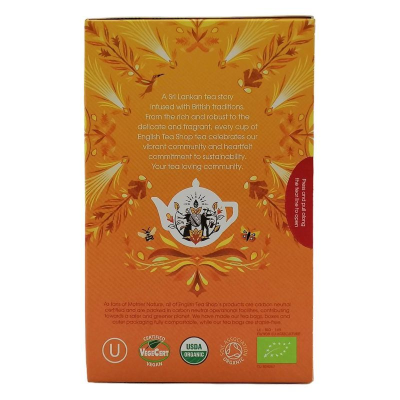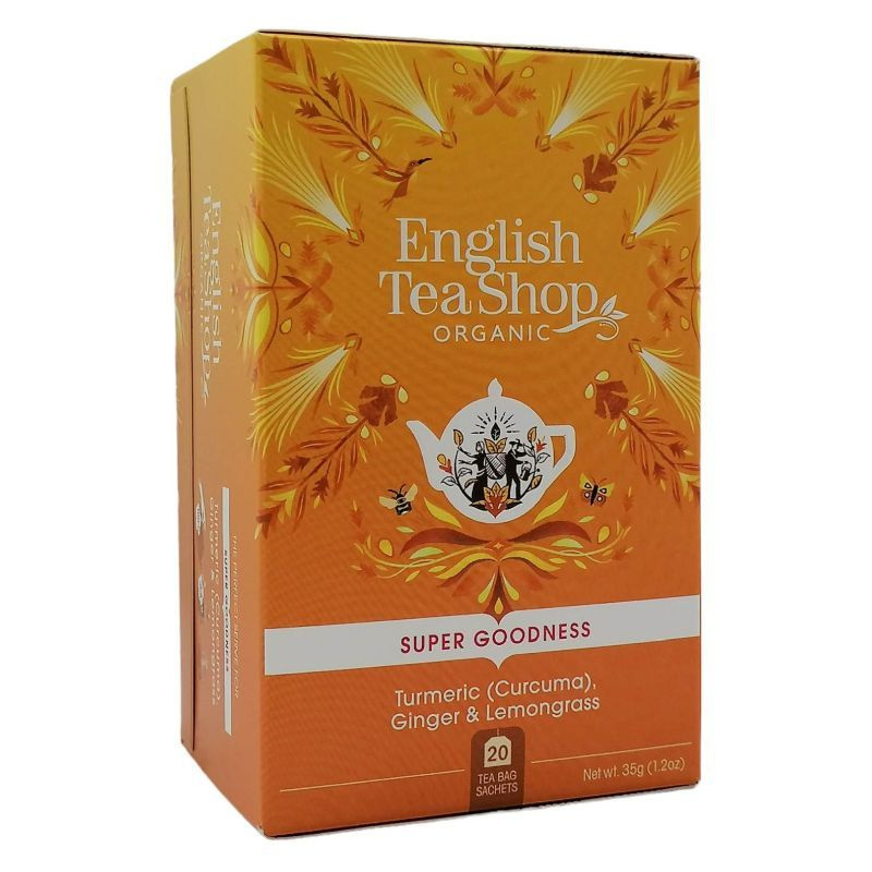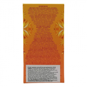 20db teafilter. Összetevők: gyömbér (30%)*, kurkuma (30%)*, citromfű (14%)*, édesgyökér (7%)*, szegfűszeg (6%)*, citromhéj (4%)*, kardamom (4%)*, feketebors (3%)*, római kömény (2%)*. Édesgyökeret tartalmaz! Magasvérnyomásban szenvedők kerüljék túlzott mértékű fogyasztását. *Összetevők: Ellenőrzött ökológiai gazdálkodásból.