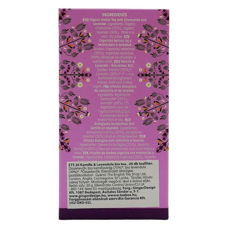 20 db teafilter. Koffeinmentes. Összetevők: kamilla*(70%), levendula*(30%). *Összetevők: Ellenőrzött ökológiai gazdálkodásból.
