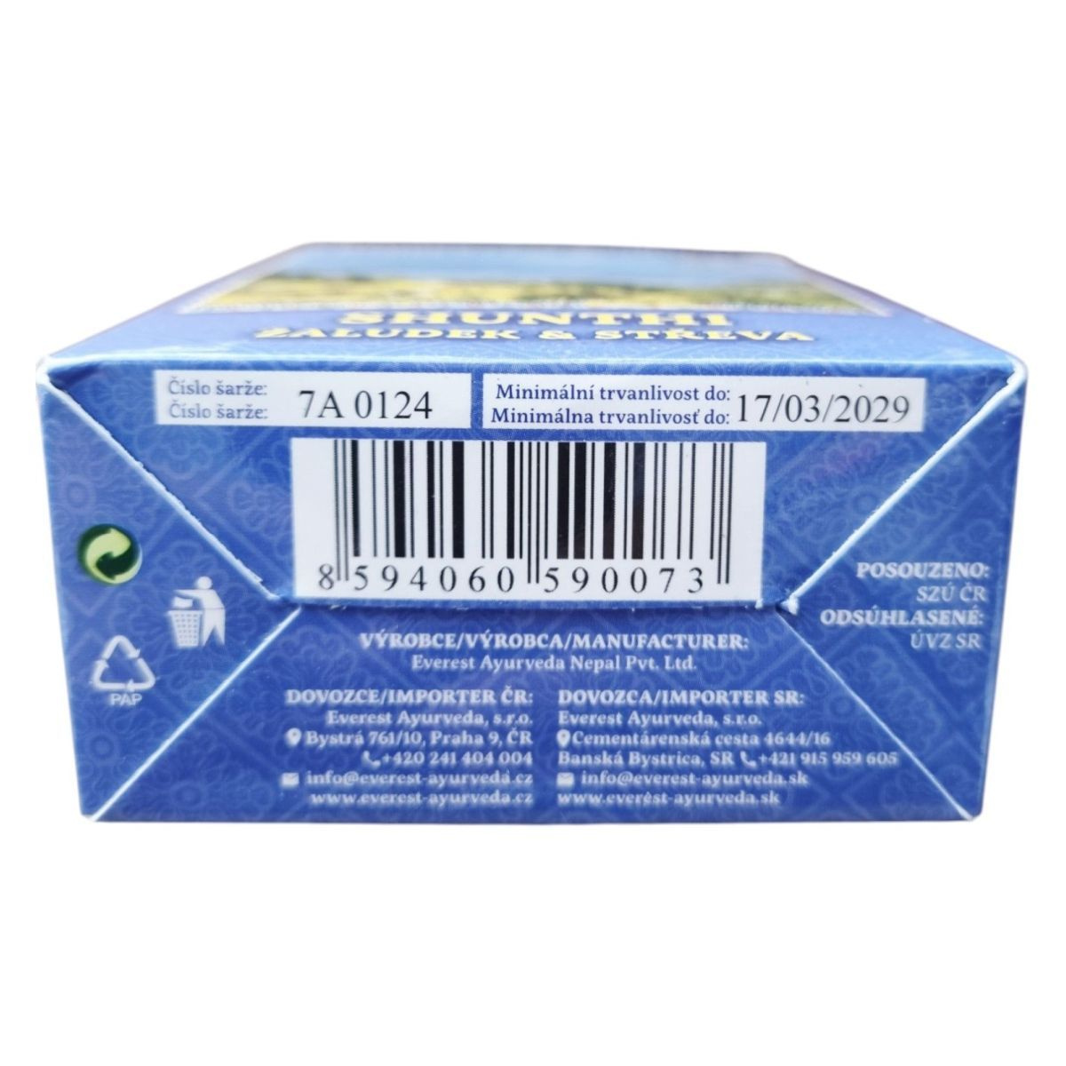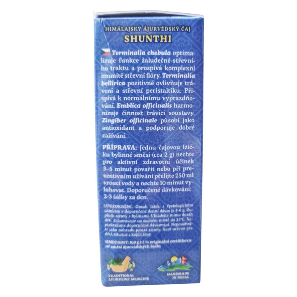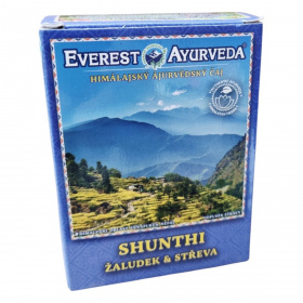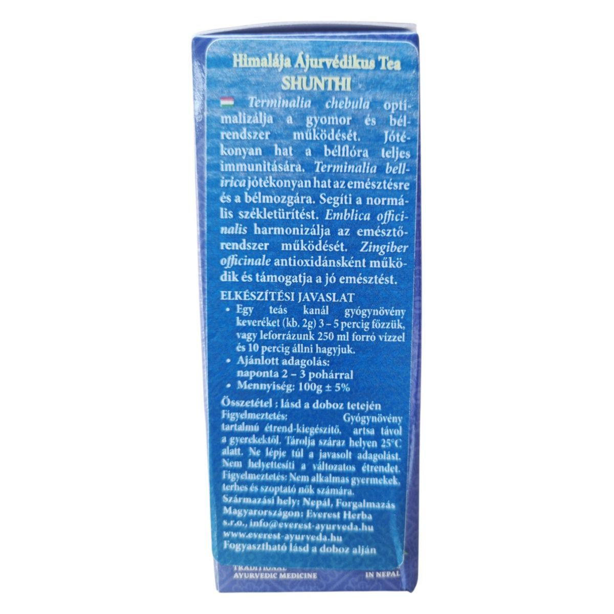 Az Everest Ayurveda® Shunthi Himalájai Ayurvédikus Tea egy tradicionális nepáli gyógynövénykeverék, amely a Himalája gyógynövényeit tartalmazza. A Terminalia chebula és Terminalia bellirica hozzájárulhat a gyomor és bélrendszer optimális működéséhez, míg az Emblica officinalis harmonizálhatja az emésztőrendszert. A Zingiber officinale antioxidánsként támogathatja a jó emésztést. Az elkészítési javaslat szerint egy teáskanál keveréket 3–5 percig főzzünk, vagy 250 ml forró vízzel leforrázva 10 percig állni hagyjuk. A termék Nepálból származik, és Magyarországon az Everest Herba forgalmazza.