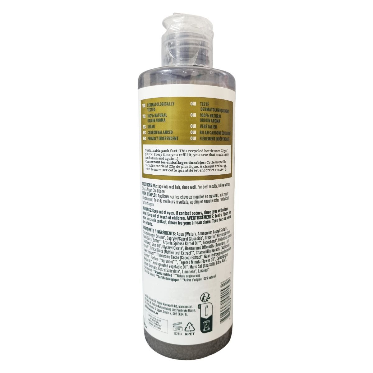 Víz (Aqua), ammónium-lauril-szulfát, kókuszolaj eredetű felületaktív anyag (Cocamidopropyl Betaine), cukor alapú tisztító összetevő (Caprylyl/Capryl Glucoside), glicerin, shea vaj (Butyrospermum Parkii Butter), argánolaj (Argania Spinosa Kernel Oil), E-vitamin (Tocopherol), napraforgómag-olaj (Helianthus Annuus Seed Oil), glicerin-oleát, rozmaring levél kivonat (Rosmarinus Officinalis Leaf Extract), csalánlevél kivonat (Urtica Dioica Leaf Extract), kamillavirág kivonat (Chamomilla Recutita Flower Extract), kakaó kivonat (Theobroma Cacao Extract), guárgumi származék (Guar Hydroxypropyltrimonium Chloride), illatanyag (Parfum), tagetes virágolaj (Tagetes Minuta Flower Oil), pálmarózsa olaj (Cymbopogon Martini Oil), hidrogénezett növényi olaj, tengeri só (Maris Sal), citromsav (Citric Acid), nátrium-benzoát, benzil-szalicilát, limonén, linalool
