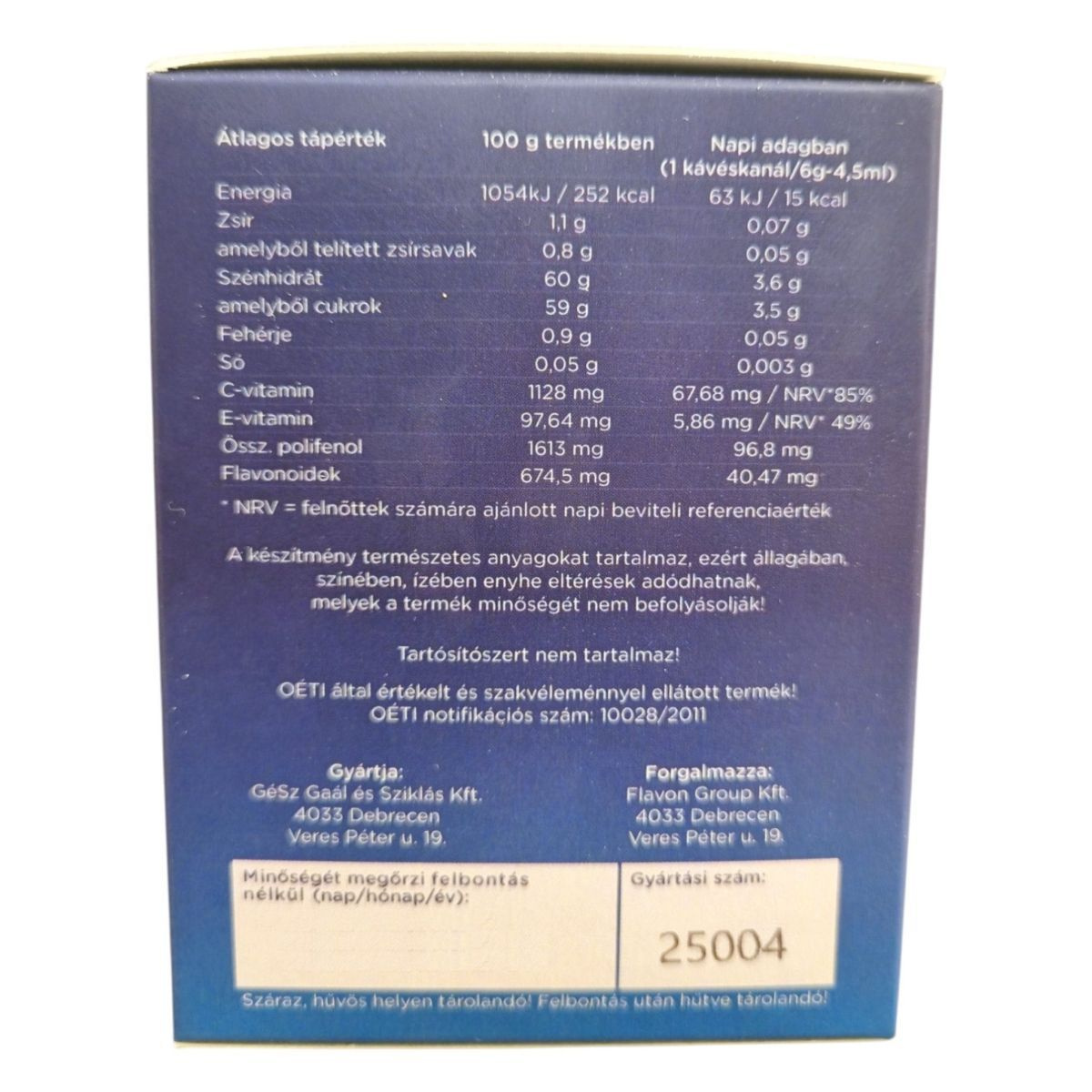 A Flavon Max+ egy polifenolokat tartalmazó étrend-kiegészítő készítmény, amely különböző gyümölcsök lékoncentrátumait tartalmazza, mint például gránátalma, fekete bodzabogyó és kékszőlő. A termék C- és E-vitamin tartalma hozzájárulhat az immunrendszer és az idegrendszer normál működéséhez, valamint a sejtek oxidatív stresszel szembeni védelméhez. A Panax ginseng adaptogén hatása miatt a termék fogyasztásában 6 hét után szünetet kell tartani, és magas vérnyomás esetén nem javasolt. A termék tartósítószert nem tartalmaz, és OÉTI által értékelt és szakvéleménnyel ellátott.