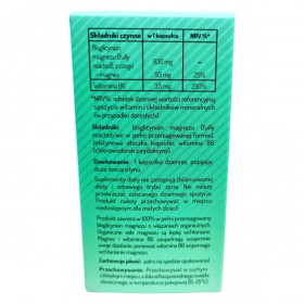 Magnézium-biszglicinát (teljesen reagált formában), zselatin kapszulahéj, B6-vitamin (piridoxin-hidroklorid).