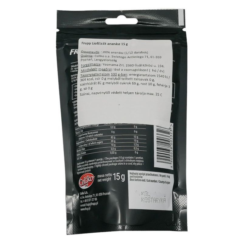 A Frupp ananász ízletes, ropogós és finom. Próbáld ki még ma snackként, vagy add hozzá desszertekhez, süteményekhez vagy joghurtokhoz, és győződj meg róla!10% természetes rost,gluténmentes.Az ananász számos értékes összetevőt tartalmaz, amelyekre a szervezetnek szüksége van, például rengeteg C-vitamint, A-, B1-, B2-, B6- és niacint, antioxidánsokat és bromelaint - az anyagcserét felgyorsító enzimet.