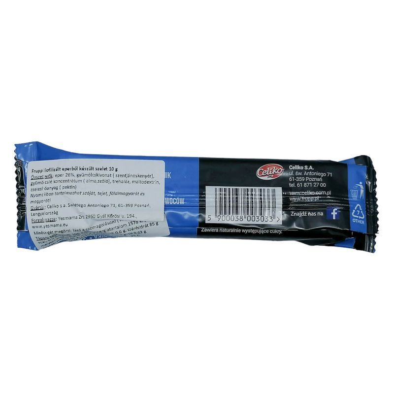 Maximális íz - minimális kalória! Frupp - egy finom és egészséges snack. A maga nemében az első, fagyasztva szárított gyümölcsből készült szelet, rendkívül intenzív eper ízzel. Egy szelet mindössze 37 kcal-t tartalmaz és 7% rostot, a nyári gyümölcsök lédús, édes íze pedig tökéletesen kielégíti az édesség utáni vágyat.