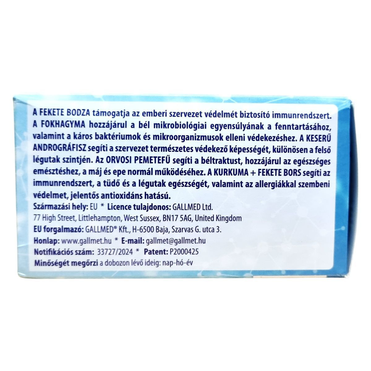 A GALLMET® IMMUNE (ANTIBAC) étrendkiegészítő kapszula természetes összetevőkkel készülhet, mint például a liofilizált marha epe, fekete bodza kivonat, kurkuma kivonat, orvosi pemetefű kivonat, keserű andrográfisz kivonat, fokhagyma kivonat és fekete bors kivonat. Ezek az összetevők hozzájárulhatnak az immunrendszer támogatásához és az emésztés javításához, valamint segíthetnek a káros baktériumok és mikroorganizmusok elleni védekezésben. A termék használata előtt ajánlott szakemberrel konzultálni, különösen, ha más epére ható készítményeket is szed, vagy véralvadás-gátló gyógyszert használ. A készítmény nem helyettesíti a kiegyensúlyozott, vegyes étrendet és az egészséges életmódot.