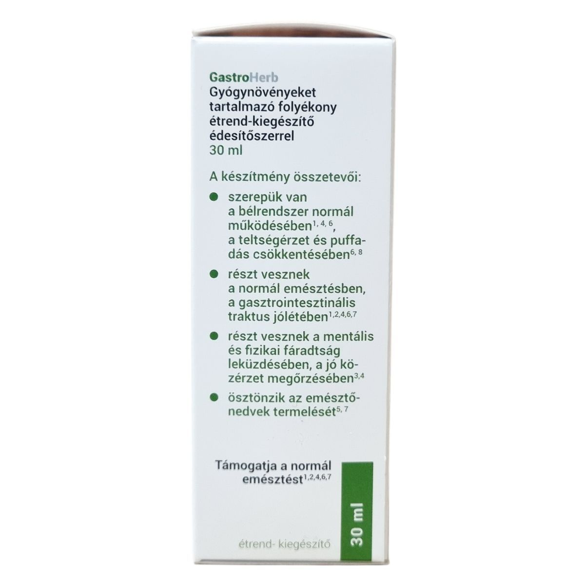 A GastroHerb egy gyógynövényeket tartalmazó folyékony étrend-kiegészítő, amely különféle növényi kivonatokból és esszenciális olajokból áll. Összetevői között szerepelnek például tömjénfa gyanta-kivonat, máriatövis mag-kivonat, zöldtea levél-kivonat, citromfű levél-kivonat, kurkuma gyökér-kivonat, illetve borsmenta, ánizs és kömény olajok. Ezek az összetevők szerepet játszhatnak a bélrendszer normál működésében, a teltségérzet és puffadás csökkentésében, valamint a gasztrointesztinális traktus jólétének támogatásában. Ezen felül hozzájárulhatnak a mentális és fizikai fáradtság leküzdésében és a jó közérzet megőrzésében, továbbá ösztönözhetik az emésztőnedvek termelését. A termék édesítőszerrel készül, és 30 ml kiszerelésű, amely napi adagja 3 ml. A készítmény használata során figyelembe kell venni az ajánlott adagolást és a figyelmeztetéseket, valamint a tárolási útmutatókat is. A GastroHerb fogyasztása a kiegyensúlyozott étrend és egészséges életmód kiegészítését szolgálja.