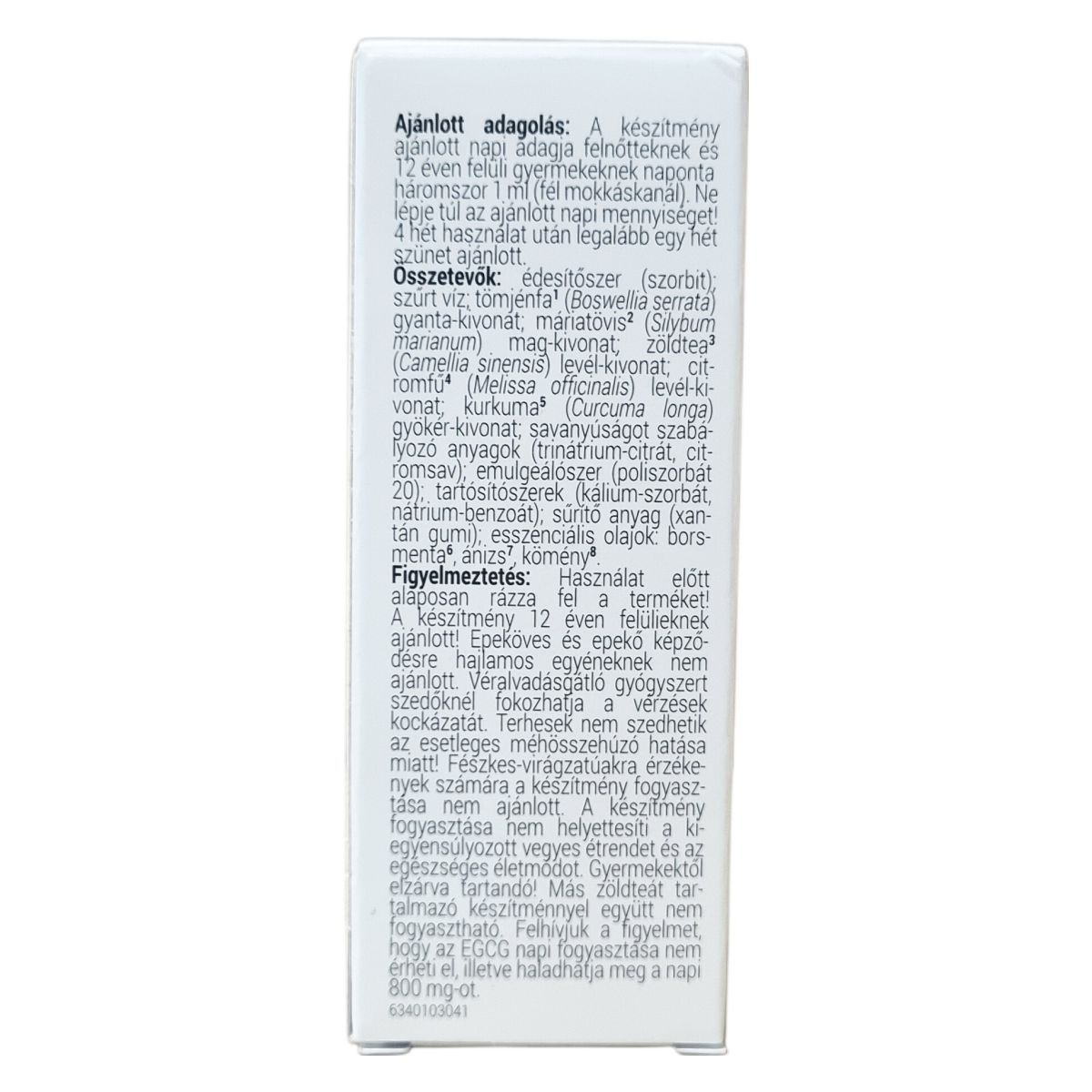 Használat előtt alaposan rázza fel a terméket! A készítmény 12 éven felülieknek ajánlott. Epeköves és epekő képződésre hajlamos egyéneknek nem ajánlott. Véralvadásgátló gyógyszert szedőknél fokozhatja a vérzések kockázatát. Terhesek nem szedhetik az esetleges méhösszehúzó hatás miatt. Fészkes-virágzatúakra érzékenyek számára a készítmény fogyasztása nem ajánlott. A készítmény fogyasztása nem helyettesíti a kiegyensúlyozott vegyes étrendet és az egészséges életmódot. Gyermekektől elzárva tartandó. Más zöldteát tartalmazó készítménnyel együtt nem fogyasztható. Felhívjuk a figyelmet, hogy az EGCG napi fogyasztása nem érheti el, illetve nem haladhatja meg a napi 800 mg-ot.