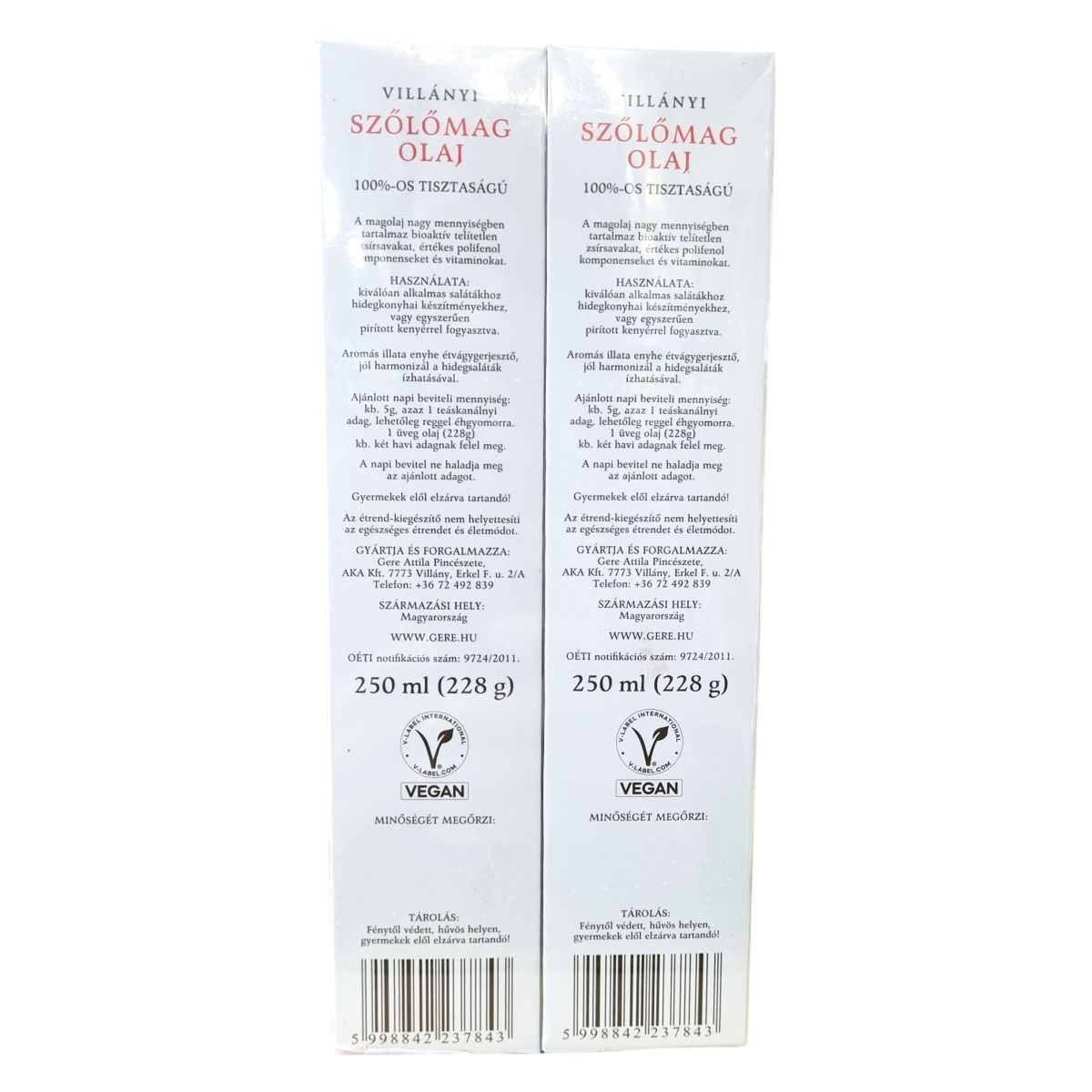 A Gere Pincészet családjából származó Villányi Szőlőmag Olaj 100%-os tisztaságú, hidegsajtolt olaj, mely a Villányi termőtáj esszenciáját hordozza. Az olaj aromás illata enyhe étvágygerjesztő hatású, és jól harmonizál a saláták ízhatásával. Kiválóan alkalmas salátákhoz, hidegkonyhai készítményekhez, illetve pirított kenyérrel fogyasztva is élvezhető. Egy üveg (228 g) körülbelül két havi adagot jelent. Származási helye Magyarország.