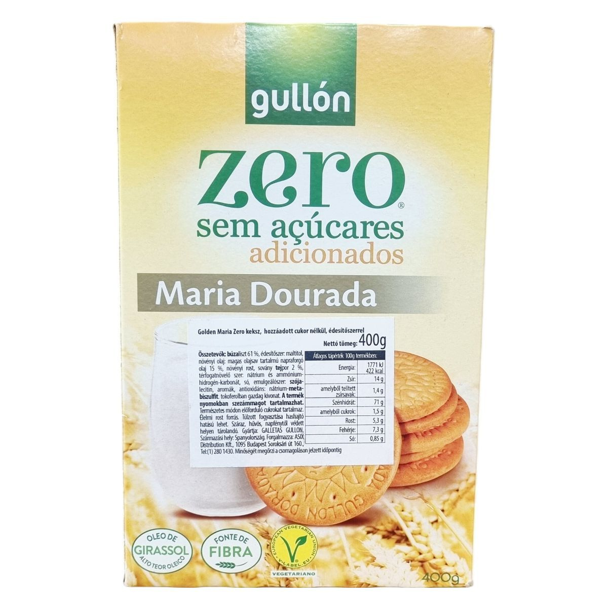 A Gullón Golden Maria Zero keksz egy alacsony hozzáadott cukortartalmú finomság, amely maltitollal édesített. A termék összetevői között a búzaliszt, magas olajsavtartalmú napraforgóolaj, növényi rost és sovány tejpor találhatók, emellett térfogatnövelő és antioxidáns anyagokat is tartalmaz. Kíváló rostforrás, és a vegetáriánus étrendet követők számára is alkalmas. A csomag körülbelül 60 darab, egyenként 6,7 grammos kekszet tartalmaz. Az élelmiszeripari előírásoknak megfelelően tartalmazhat természetes cukrokat és nyomokban szezámmagot. Ajánlott változatos étrend részeként, mértékkel fogyasztani, mivel túlzott bevitele hashajtó hatású lehet. A termék spanyolországi gyártásból származik, és gondosan tárolva, napfénytől védve hosszabb ideig megőrzi minőségét.