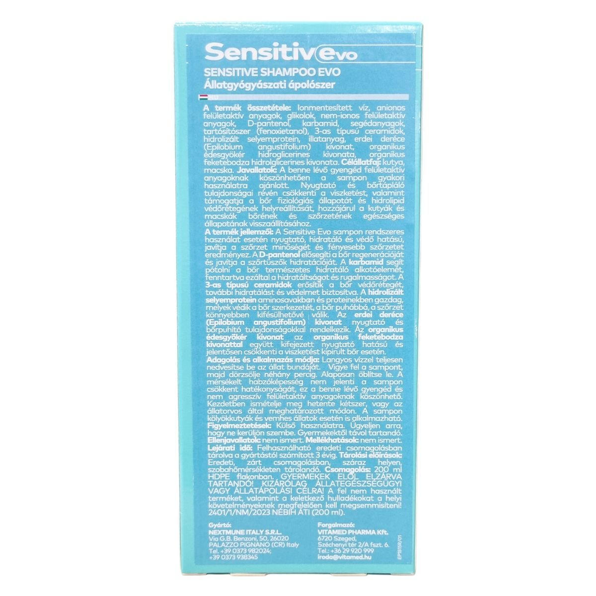 A Sensitive Evo sampon rendszeres használata nyugtató, hidratáló és védő hatású, támogatja a bőr fiziológiás állapotát és a hidrolipid védőréteg helyreállítását. A D-pantenol segítheti a bőr regenerációját és a szőrtüszők hidratáltságát, míg a karbamid fenntartja a rugalmasságot. A ceramidok erősítik a bőr védővonalát, a selyemprotein pedig puhítja a szőrzetet és könnyíti a fésülést. Az erdei deréce bőrpuhító hatású, az organikus édesgyökér és feketebodza kivonatok pedig jelentősen csökkenthetik a viszketést. Ideális fehér szőrű állatok számára is. A fel nem használt terméket a helyi előírásoknak megfelelően kell megsemmisíteni.