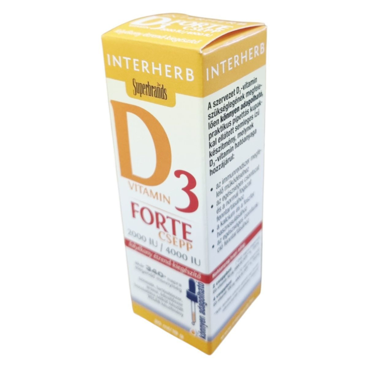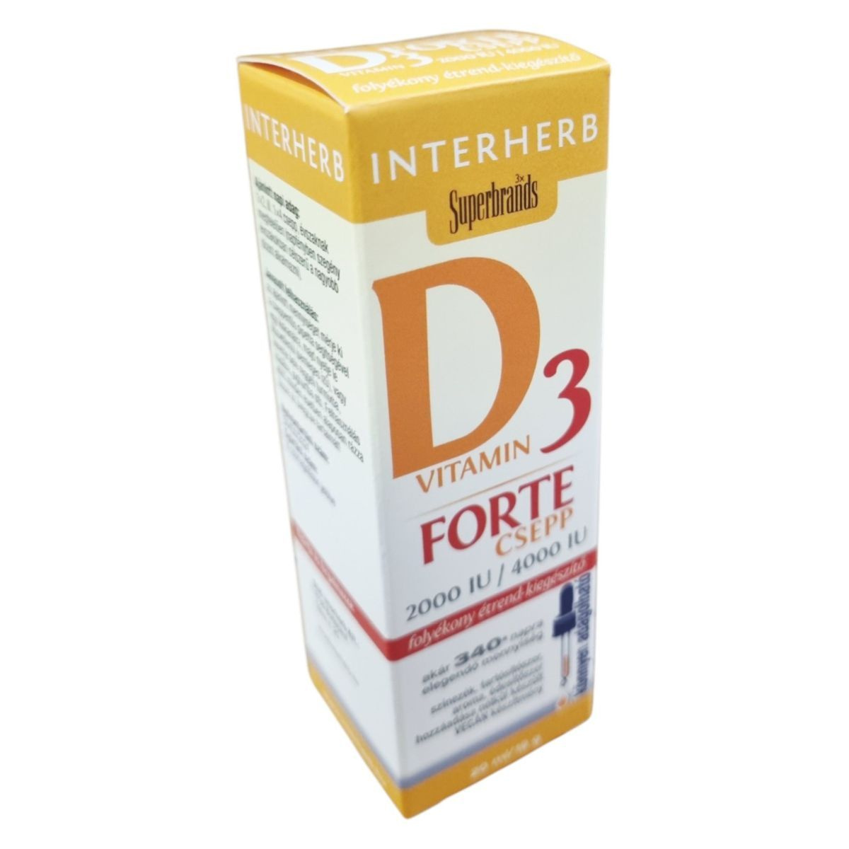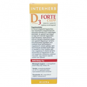 Az INTERHERB D3 Vitamin Forte Csepp egy praktikus pipettás kupakkal ellátott, semleges ízű készítmény, amely akár 340 napra elegendő mennyiséget biztosít. A termék hozzájárulhat az immunrendszer megfelelő működéséhez, az egészséges csontozat és fogazat fenntartásához, valamint a kalcium és foszfor hasznosulásához. A készítmény vegán, és nem tartalmaz színezéket, tartósítószert, aromát vagy édesítőszert. Az ajánlott napi adag 1×2 vagy 1×4 csepp, évszaktól függően. A termék használata előtt alaposan rázza fel az üveg tartalmát, és a cseppeket közvetlenül nyelje le, vagy keverje bele reggeli turmixba, kásába, joghurtba.