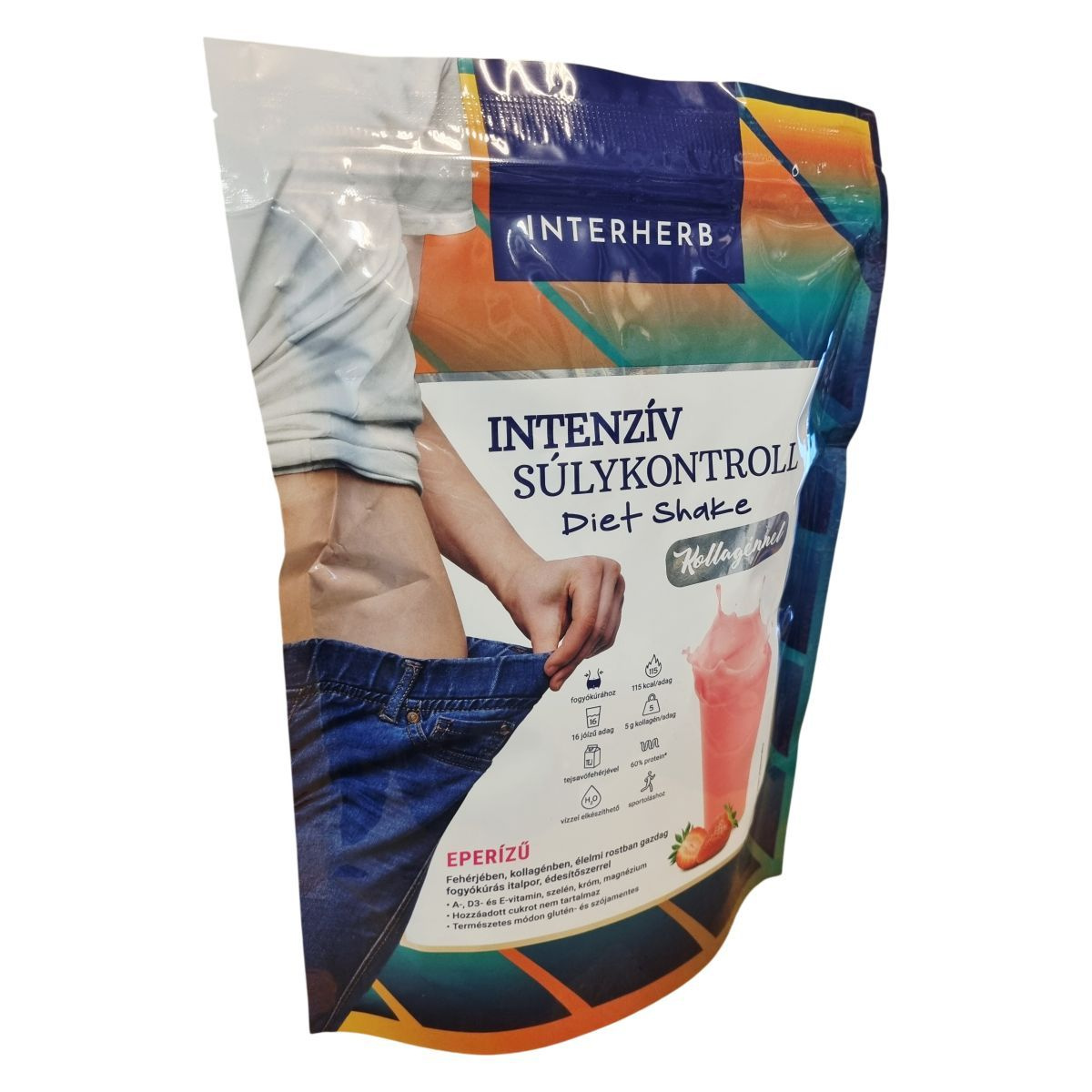 Az Interherb Intenzív Súlykontroll Diet Shake eperízű, fehérjében, kollagénben és élelmi rostban gazdag fogyókúrás italpor. Vízzel elkészítve alacsony cukortartalmú, éhségcsökkentő és telítő hatású, támogatva a diétás étrendet. A termék tejsavófehérje koncentrátumot, hidrolizált szarvasmarha kollagént, valamint glükomannánt és rostokat tartalmaz, melyek hozzájárulhatnak a testtömegcsökkenéshez és az éhségérzet csökkentéséhez. Kétféleképpen fogyasztható: shake formájában vagy pudingként, mely utóbbi 5-10 perc alatt sűrűsödik, és ízlés szerint gyümölcsökkel is kiegészíthető. A készítmény vitaminokat és ásványi anyagokat is tartalmaz, amelyek hozzájárulhatnak a vitalitás fenntartásához. Alkalmas súlykontroll mellett fehérjebevitel biztosítására diétázók, sportolók, idősek és étkezési nehézségekkel küzdők számára.