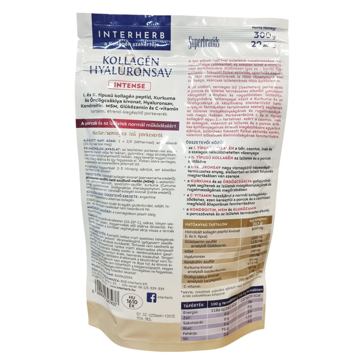 Az izületek rugalmassága és teherbíró képessége a kor előrehaladtával csökkenhet, ami befolyásolhatja a mindennapi életvitelt, különösen fokozott fizikai aktivitás vagy sport esetén. Ezért szervezetünknek és izületeinknek több építőelemre lehet szüksége. Az Interherb Kollagén Hyaluronsav Intense porkeverék jól oldódó, semleges ízű és nagydózisban tartalmazza az izületek természetes alkotóelemeit. A kurkuma és az ördögcsáklya standardizált kivonatai hozzájárulhatnak az izületek mozgékonyságának és rugalmasságának megőrzéséhez. A benne található I. típusú kollagén a bőr, csontok, inak és szalagok nélkülözhetetlen vázanyaga, míg a II. típusú kollagén az izületek és porcok építőköve. A hyaluronsav nagy vízmegkötő képessége révén elsősorban az izületi folyadék megtartásában játszhat szerepet. A C-vitamin hozzájárulhat a normál kollagénképződéshez, ezáltal a porcok és csontok megfelelő állapotának fenntartásához, míg a kondroitin, MSM és glükózamin a porcszövetek és izületek természetes alkotóelemei lehetnek. A termék cukor-, édesítőszer-, aroma-, színezék- és tartósítószer-mentes, természetes módon glutén- és laktózmentes, így sokféle étrendi igényhez illeszthető. Fogyasztása 2-3 hónapos kúrában javasolt, ezt követően 2 hét szünet ajánlott.