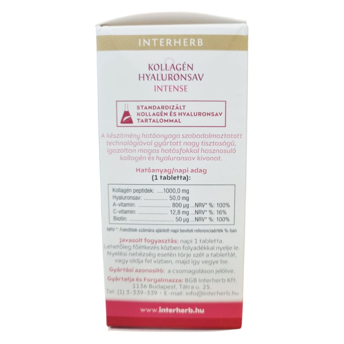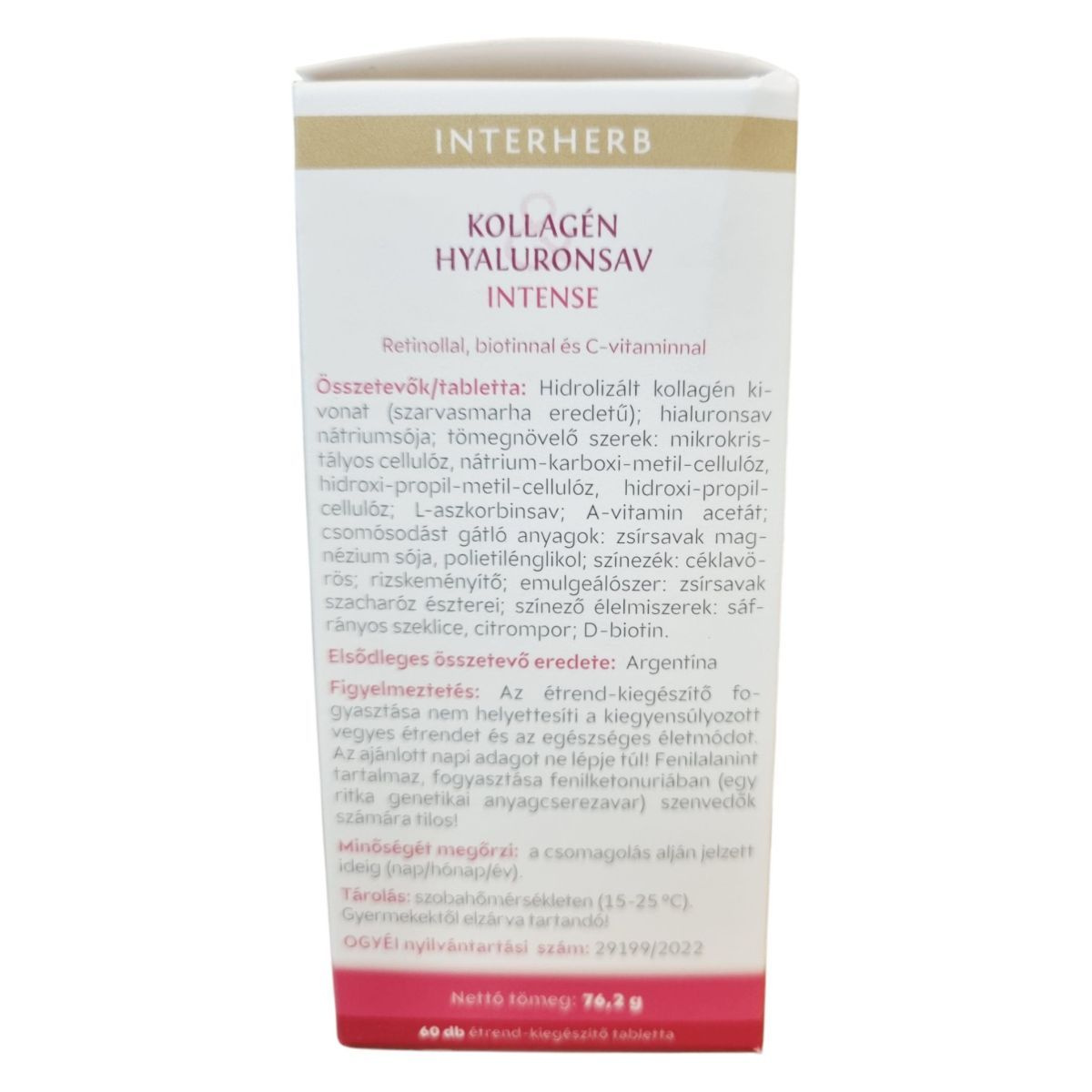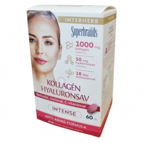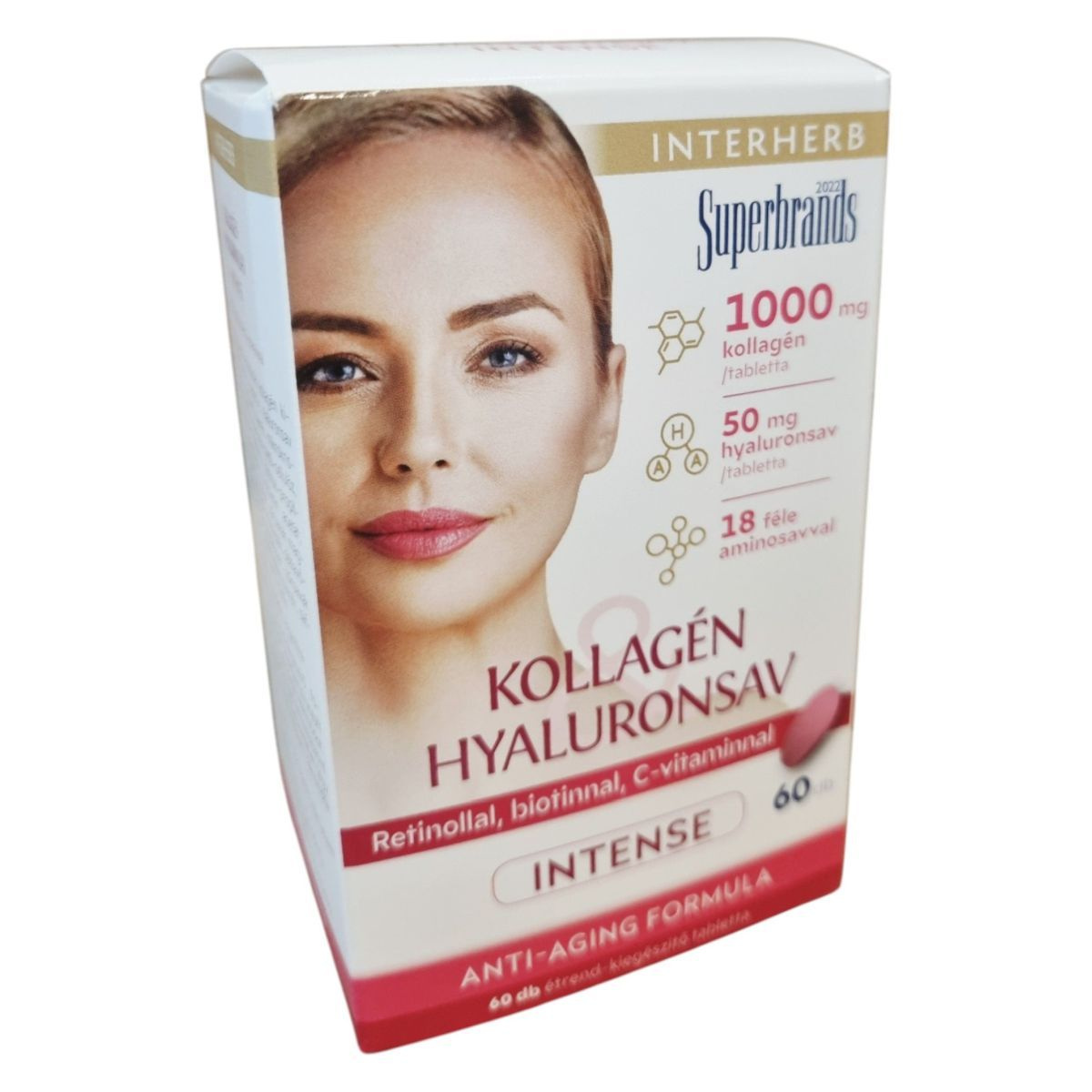 Az INTERHERB KOLLAGÉN & HYALURONSAV INTENSE egy komplex étrend-kiegészítő, amely hidrolizált kollagén peptidet és hyaluronsavat tartalmaz. Ezek az összetevők hozzájárulhatnak a bőr szerkezeti felépítéséhez és rugalmasságához. A termék A-vitamint, C-vitamint és biotint is tartalmaz, amelyek támogathatják a bőr és a haj egészségét. Az étrend-kiegészítő szarvasmarha eredetű kollagént tartalmaz, és szabadalmaztatott technológiával készült, hogy magas hatásfokkal hasznosuljon a szervezetben. A termék 60 tablettát tartalmaz, és napi egy tabletta fogyasztása javasolt.