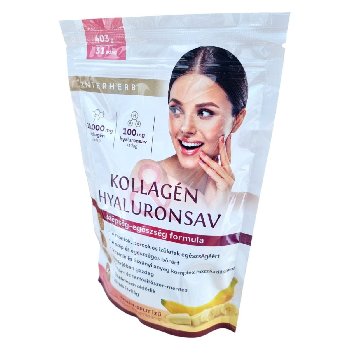 Az INTERHERB KOLLAGÉN & HYALURONSAV italpor egy komplex étrend-kiegészítő, amely nagy dózisú kollagént és hyaluronsavat tartalmaz, hozzájárulva a bőr, a porcok és az ízületek egészségéhez. A termék 8 féle ásványi anyaggal és vitaminnal gazdagított, így támogatva a szervezet különböző funkcióit. A kollagén a bőr- és porcszerkezet nélkülözhetetlen vázanyaga, míg a hyaluronsav a bőrszövet építője, nagy vízmegkötő képességgel. Az A-, C-vitamin és a biotin hozzájárulhatnak a bőr normál állapotának megőrzéséhez, míg a szelén és a cink a sejtek oxidatív stresszel szembeni védelmét támogathatják. A termék banán-split ízű, cukormentes, és tökéletesen oldódik, így kellemes fogyasztási élményt nyújt.