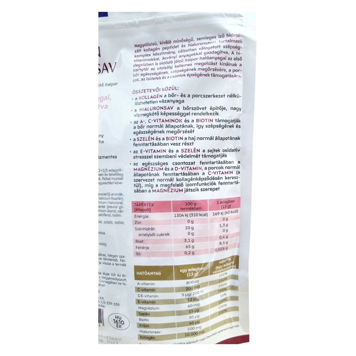A termék 10 000 mg kollagént és 100 mg hyaluronsavat tartalmaz adagonként, amelyek hozzájárulhatnak a bőr, a csontok, porcok és ízületek egészségének támogatásához. Vitaminokkal és ásványi anyagokkal gazdagítva.