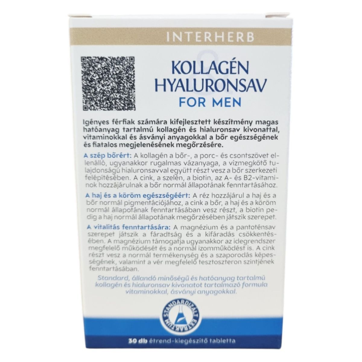 Az INTERHERB KOLLAGÉN & HYALURONSAV FOR MEN étrend-kiegészítő tabletta igényes férfiak számára készült, akik a bőrük, hajuk és körmük egészségének megőrzésére törekednek. A termék kollagén és hyaluronsav tartalmával, valamint vitaminokkal és ásványi anyagokkal segíthet a bőr normál állapotának fenntartásában, a haj és köröm egészségének támogatásában, valamint a vitalitás fenntartásában. A cink, szelén, biotin, A- és B2-vitaminok hozzájárulhatnak a bőr normál állapotának fenntartásához, míg a magnézium és a pantoténsav a fáradtság csökkentésében játszhat szerepet.