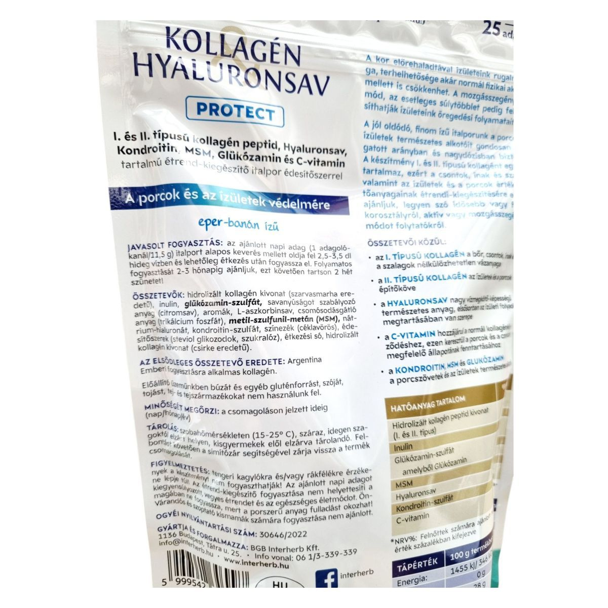 A KOLLAGÉN HYALURONSAV PROTECT italpor az ízületek és porcok védelmére szolgálhat, különösen az I. és II. típusú kollagén, hyaluronsav, kondroitin, MSM és glükózamin tartalmának köszönhetően. Az eper-banán ízű italpor kellemes ízélményt nyújthat, miközben a C-vitamin hozzájárulhat a normál kollagénképződéshez. A termék cukor- és tartósítószer-mentes, valamint természetes módon glutén- és laktózmentes, így széles körben fogyasztható. Az ajánlott fogyasztási mód szerint a termék folyamatos használata 2-3 hónapig javasolt, majd 2 hét szünet következik. A termék előállítása során nem használnak fel búzát, szóját, tojást, tejet és tejszármazékokat.