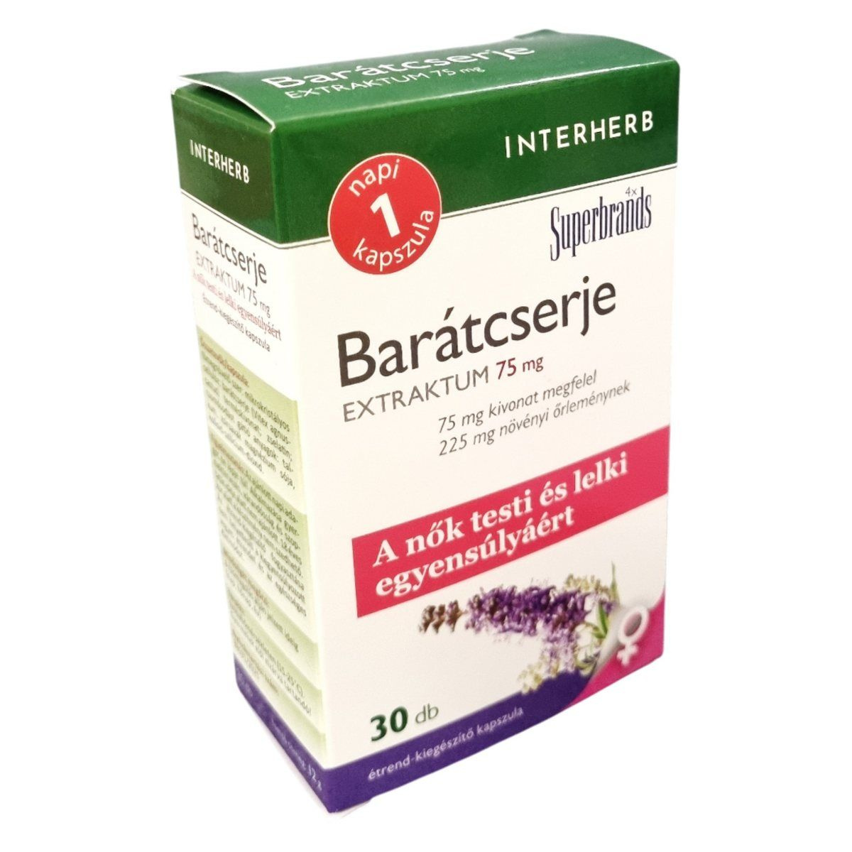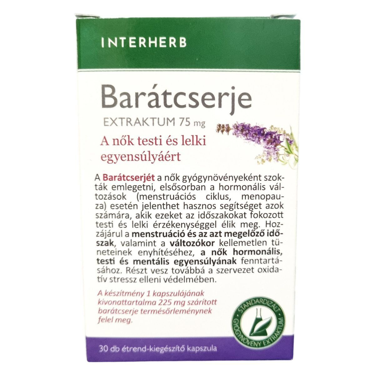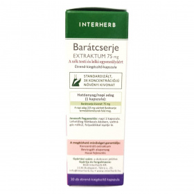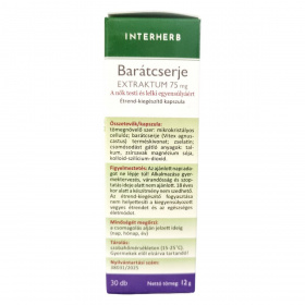 Az Interherb Barátcserje Extraktum 75 mg egy standardizált, 3x koncentrációjú növényi kivonatot tartalmazó étrend-kiegészítő kapszula, amely kifejezetten a nők testi és lelki egyensúlyának támogatására készült. A barátcserjét régóta alkalmazzák a hormonális változások időszakaiban, például a menstruációs ciklus és a menopauza alatt, mivel hozzájárulhat a kellemetlen tünetek enyhítéséhez. A készítmény a nők hormonális, testi és mentális harmóniájának fenntartásában játszhat szerepet, valamint támogathatja a szervezet oxidatív stresszel szembeni védekezését. Egy kapszula 75 mg barátcserje kivonatot tartalmaz, amely 225 mg szárított termésőrleménynek felel meg. A napi 1 kapszula szedése egyszerű és praktikus, étkezés közben ajánlott. A termék hazai fejlesztésű, bevizsgált alapanyagból készül, és a megbízható minőséget koncentrált extraktum formájában garantálja.