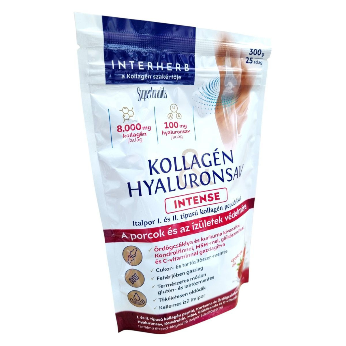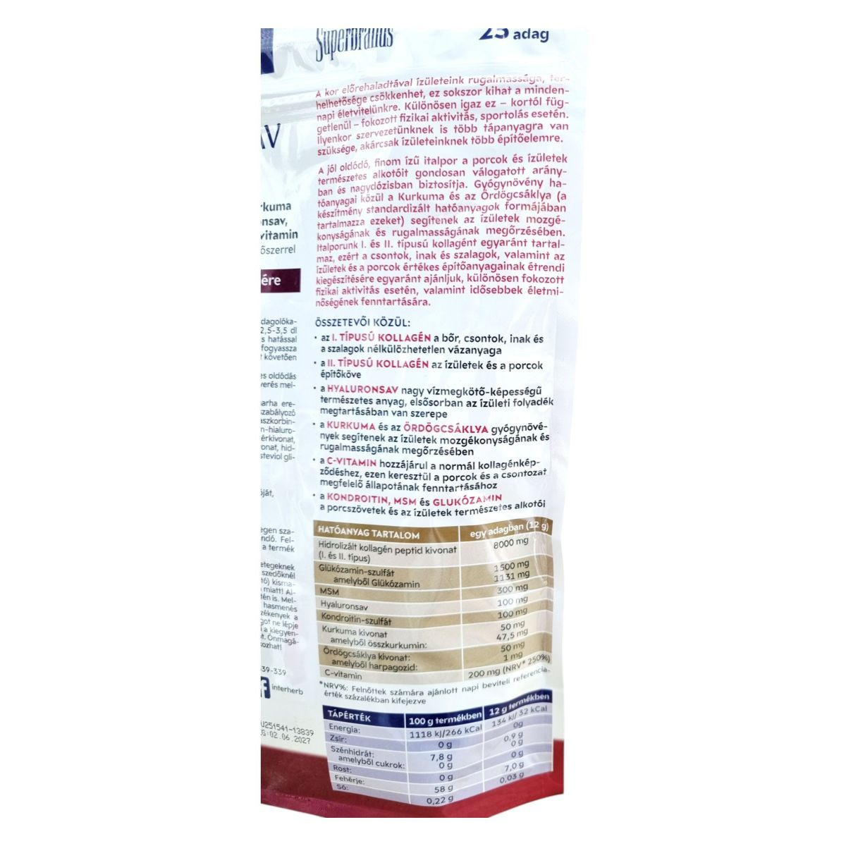 A termék I. és II. típusú kollagén peptideket, hyaluronsavat, valamint kurkuma és ördögcsáklya kivonatot tartalmazhat, amelyek hozzájárulhatnak a porcok és ízületek védelméhez. C-vitamin tartalma támogathatja a normál kollagénképződést.